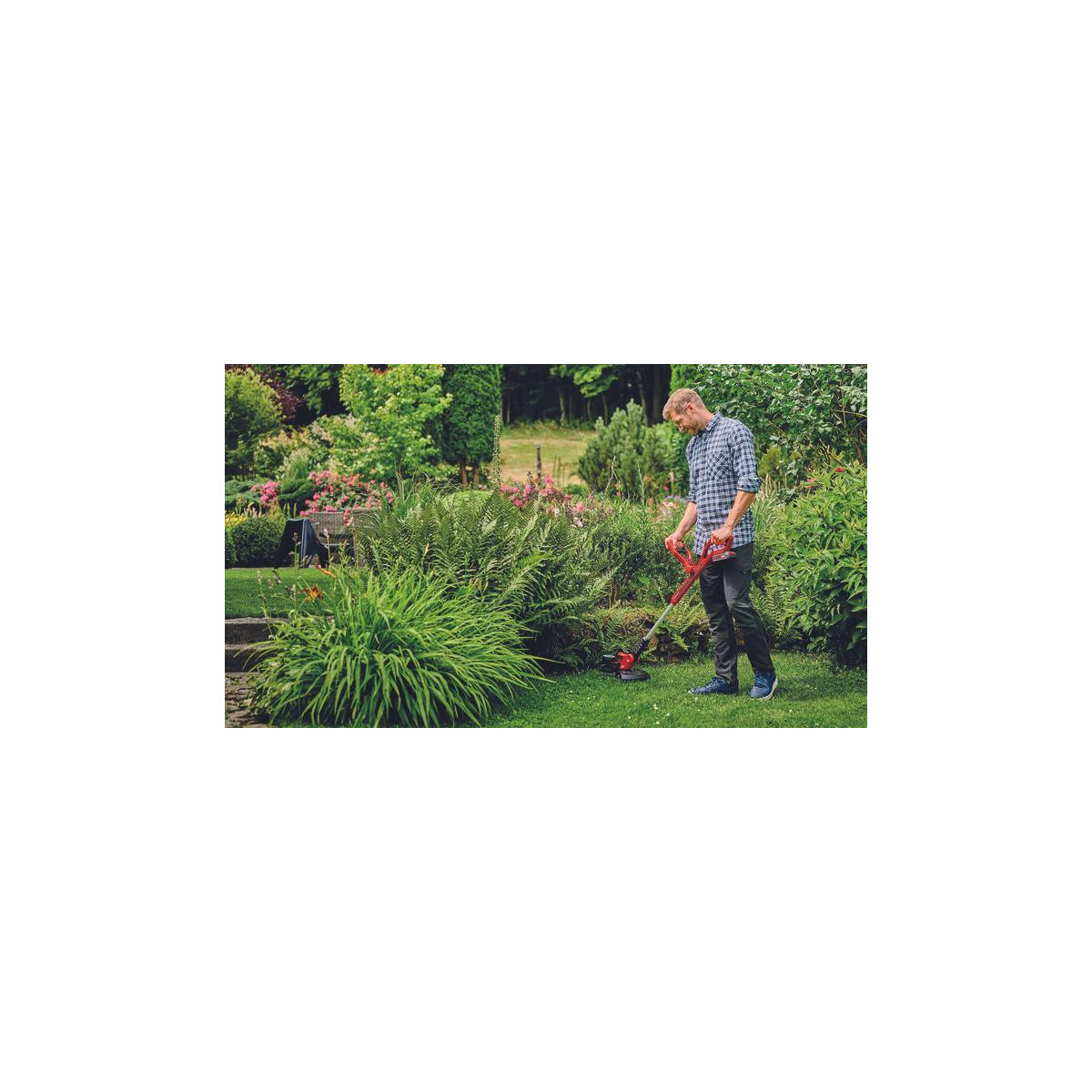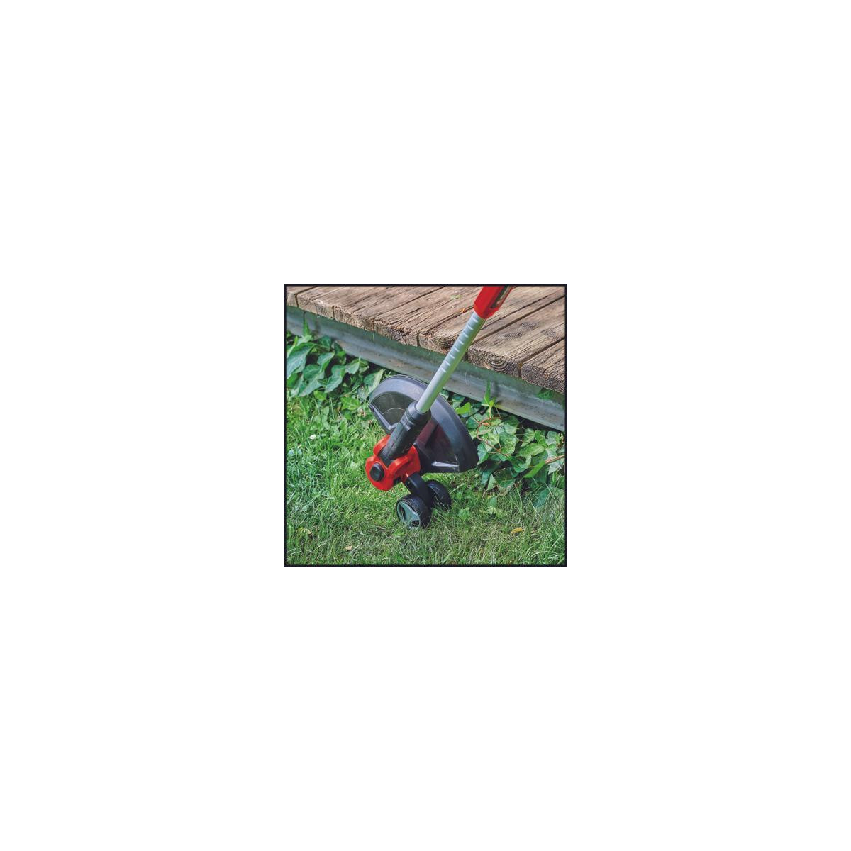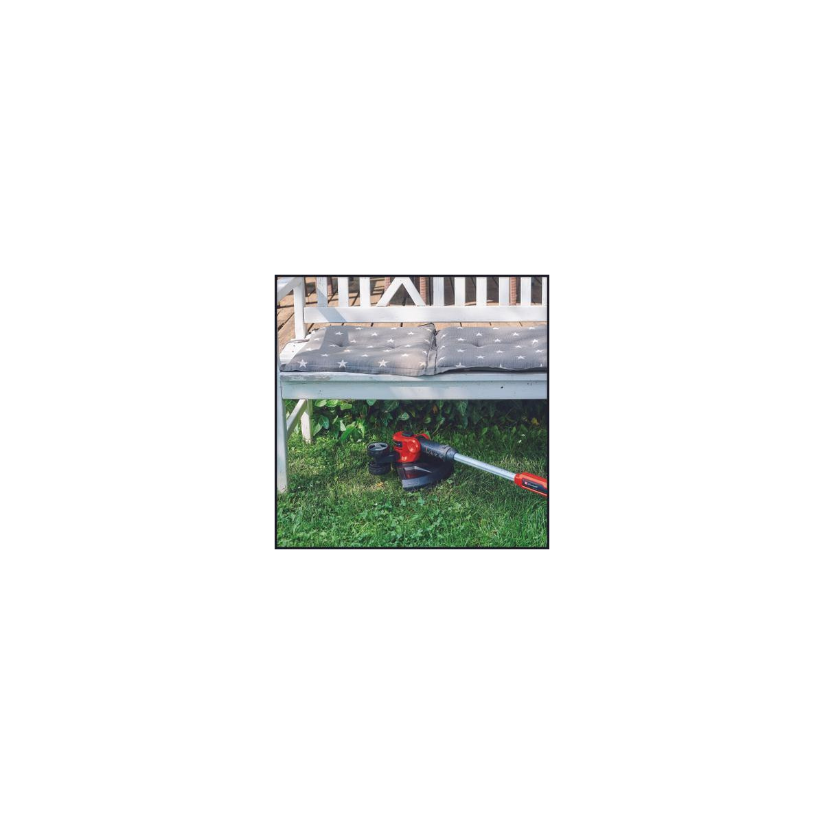 Il tagliabordi a batteria GE-CT 18/30 Li-Solo di Einhell garantisce prati perfetti. Bordi, superfici, angoli e contorni non rappresentano alcun problema: questo utensile senza cavi arriva dappertutto, anche grazie alla regolazione telescopica dell'asta dell'impugnatura di guida, mentre l'impugnatura supplementare e la superficie antiscivolo offrono comfort e maneggevolezza. La testa del motore ruota di 90° per lavorare su superfici verticali o sui bordi. Le rotelle di guida consentono di lavorare anche sui bordi. Il tagliabordi ha anche 3 livelli di inclinazione per la massima flessibilità quando si lavora sotto cespugli o altri ostacoli. La protezione per fiori e piante evita danni accidentali. È inclusa una bobina (5 m) con testina automatica a pressione facilmente sostituibile quando necessario. Il tagliabordi funziona con batterie Power X-Change da 18 V. Tutte le batterie di questa serie sono intercambiabili. La fornitura non comprende batteria e caricabatteria, che devono essere acquistati separatamente, ad esempio con il pratico Starter Kit.