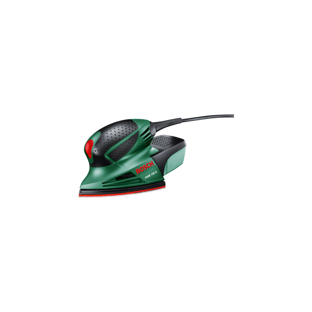 Bosch PSM 100 A. Tipo di levigatrice: Levigatrice multiuso, Fissaggio dei supporti di levigatura: Velcro, Colore del prodotto: Nero, Verde, Rosso. Velocità di oscillazione a vuoto (max.): 26000 OPM, Diametro dell'orbita: 1,4 mm, Eccentricità: 0,7 mm. Alimentazione: AC. Peso: 900 g. Superficie levigatrice: 0,0104 m², Potenza: 100 W, Valore di emissione oscillazioni: 6,5 m/s²