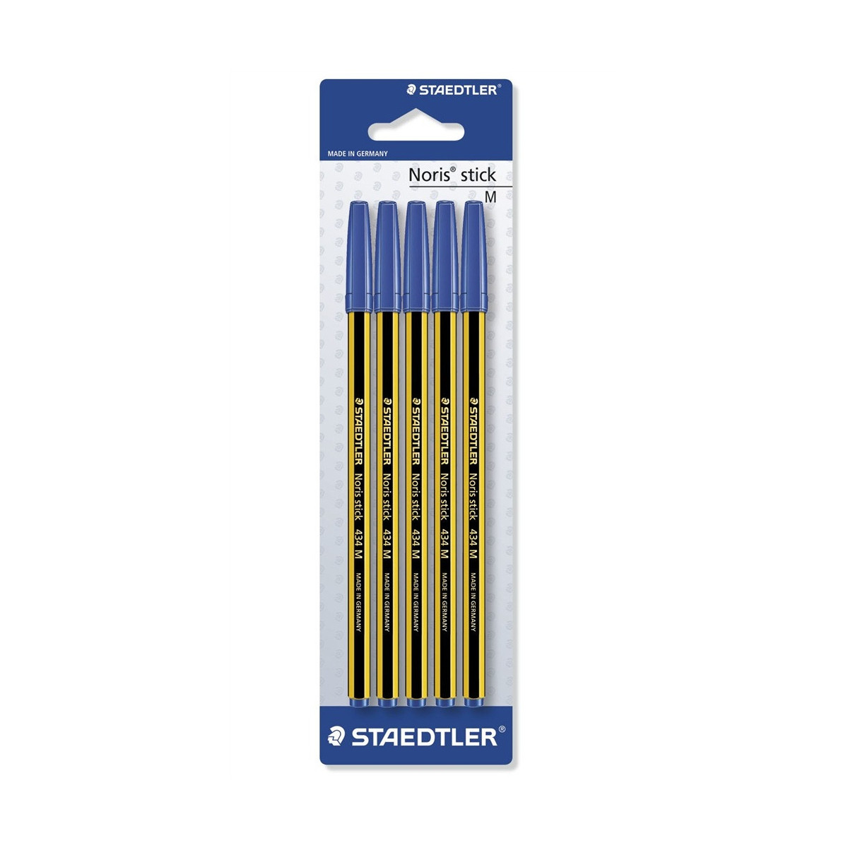 Blister con 5 penne a sfera con lungo puntale in ottone, inchiostro colore blu. Inchiostro contenuto direttamente nel fusto esagonale della penna a sfera. Cappuccio ed estremità della penna nel colore dell'inchiostro.