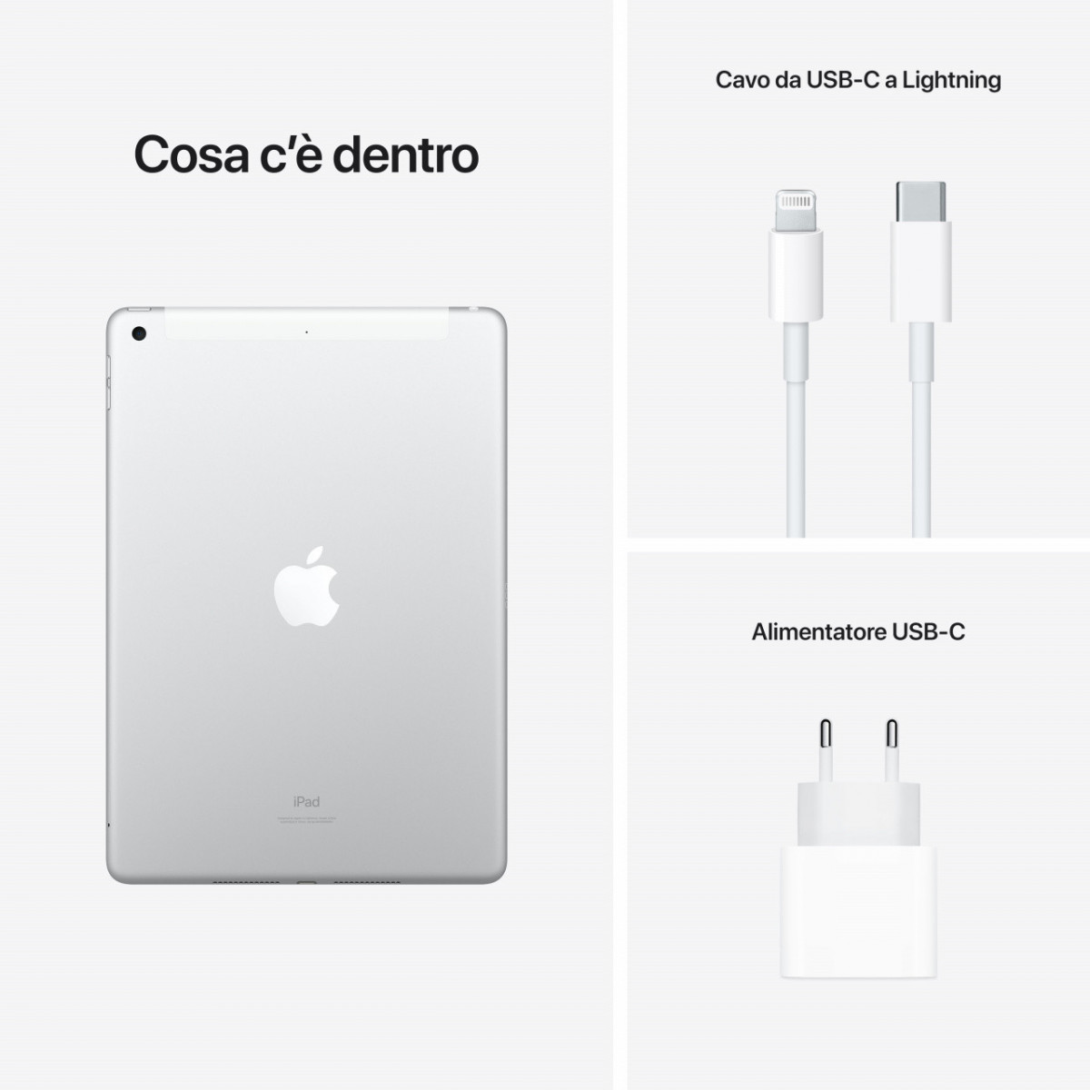 Apple iPad 10.2-inch Wi-Fi + Cellular 64GB - Argento. Dimensioni schermo: 25,9 cm (10.2"), Risoluzione del display: 2160 x 1620 Pixel, Tecnologia display: LED. Capacità memoria interna: 64 GB. Famiglia processore: Apple, Modello del processore: A13. RAM installata: 3 GB. Risoluzione fotocamera posteriore (numerico): 8 MP, Tipo di fotocamera posteriore: Fotocamera singola, Risoluzione fotocamera frontale (numerico): 12 MP. Wi-Fi standard: Wi-Fi 5 (802.11ac). Assistenza funzione GPS (A-GPS). Peso: 498 g. Sistema operativo incluso: iPadOS 15. Colore del prodotto: Argento
