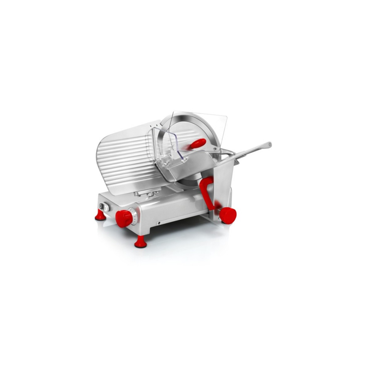 Affettatrice professionale, con struttura in alluminio, ideale per affettare salumi, carni, formaggi, verdure e pane.
