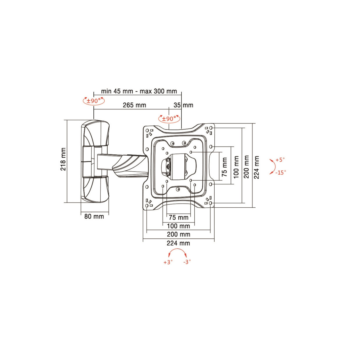 Munari SP 708. Peso massimo (capacità): 35 kg, Capienza minima dimensioni dello schermo: 66 cm (26"), Capienza massima dimensioni dello schermo: 106,7 cm (42"), Compatibilità interfaccia di montaggio (min): 75 x 75 mm, Compatibilità interfaccia di montaggio (max): 200 x 200 mm. Inclinazione: -15 - 10°, Angolo di rotazione: 90°, Distanza dalla parete (min): 4,5 cm, Distanza dal muro (massima): 30 cm. Colore del prodotto: Nero