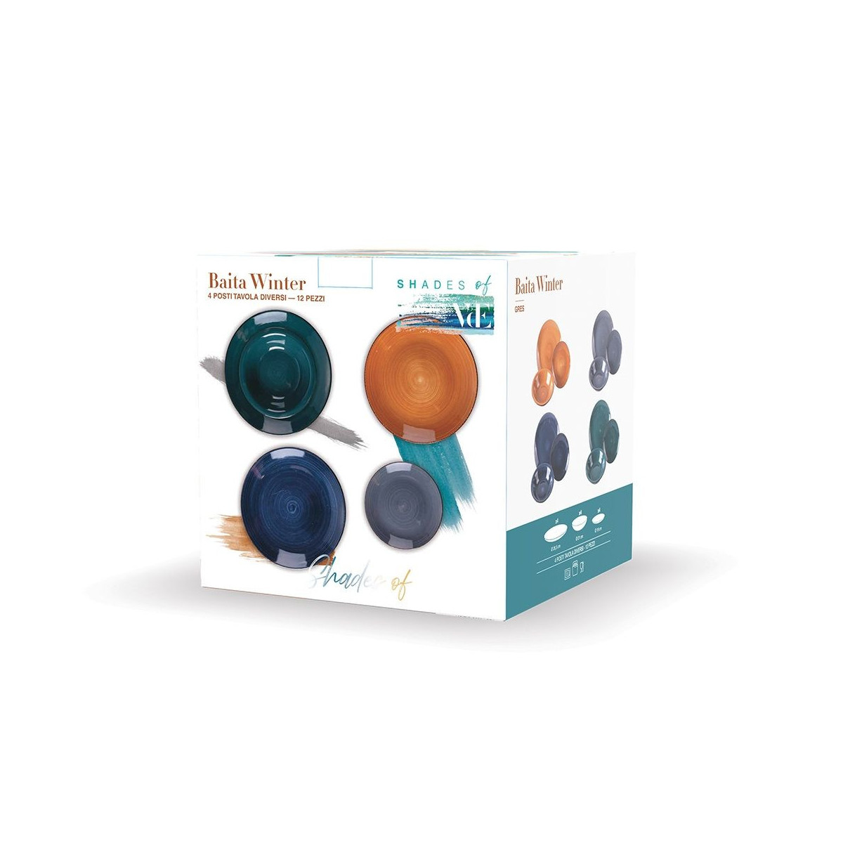 Il servizio si compone di 4 piatti piani, 4 piatti fondi, 4 piatti frutta in 4 diversi colori