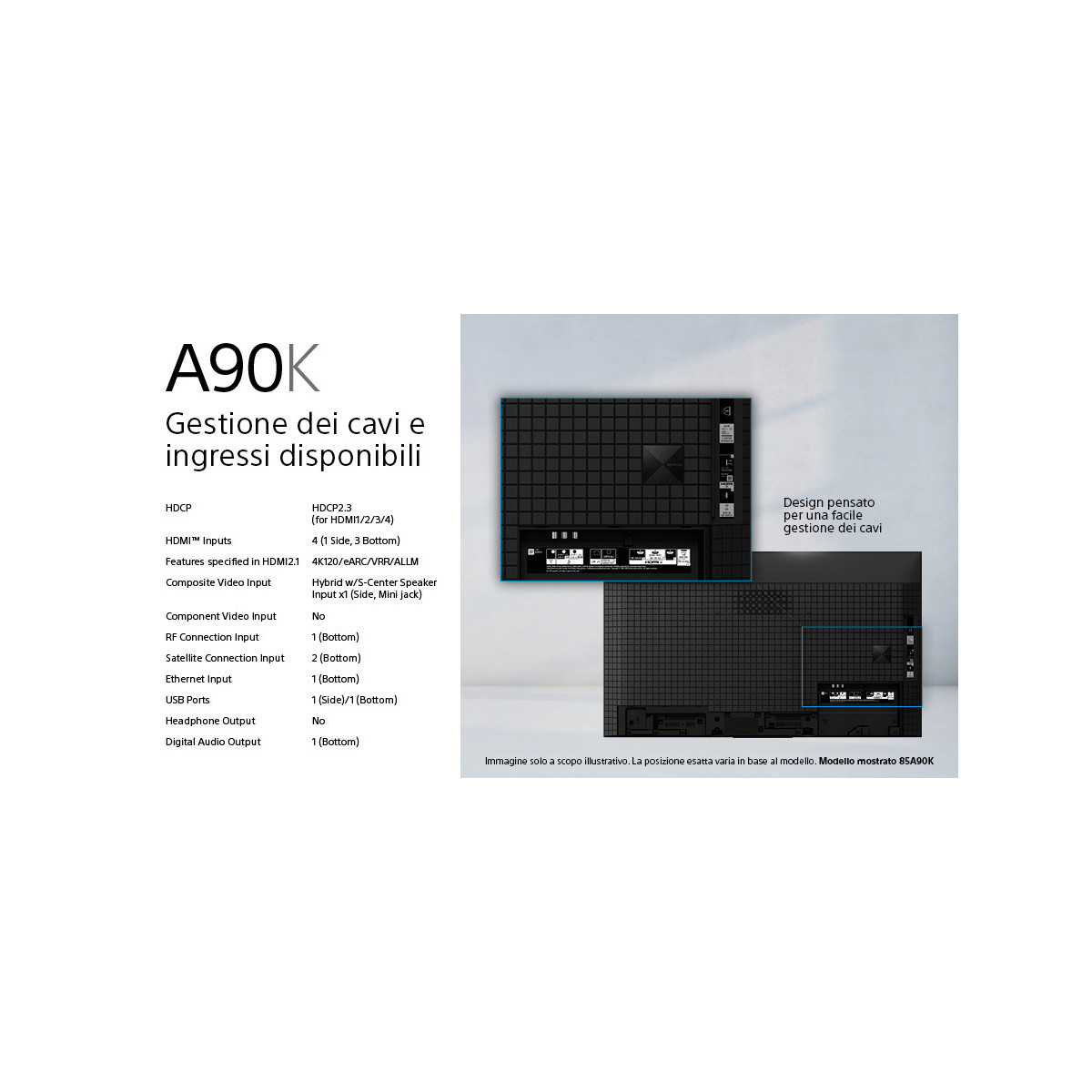 Sony XR-48A90K – 48" - BRAVIA XR™ - OLED – 4K Ultra HD – High Dynamic Range (HDR) – Smart TV (Google TV) - Modello 2022. Dimensioni schermo: 121,9 cm (48"), Risoluzione del display: 3840 x 2160 Pixel, Tipologia HD: 4K Ultra HD, Tecnologia display: OLED, Forma dello schermo: Piatto. Smart TV. Tecnologia di interpolazione del movimento: OLED Motion, Rapporto d'aspetto nativo: 16:9. Formato del segnale digitale: DVB-T2,ATSC,DVB-S,DVB-C,DVB-S2,DVB-T. Wi-Fi, Collegamento ethernet LAN. Colore del prodotto: Nero