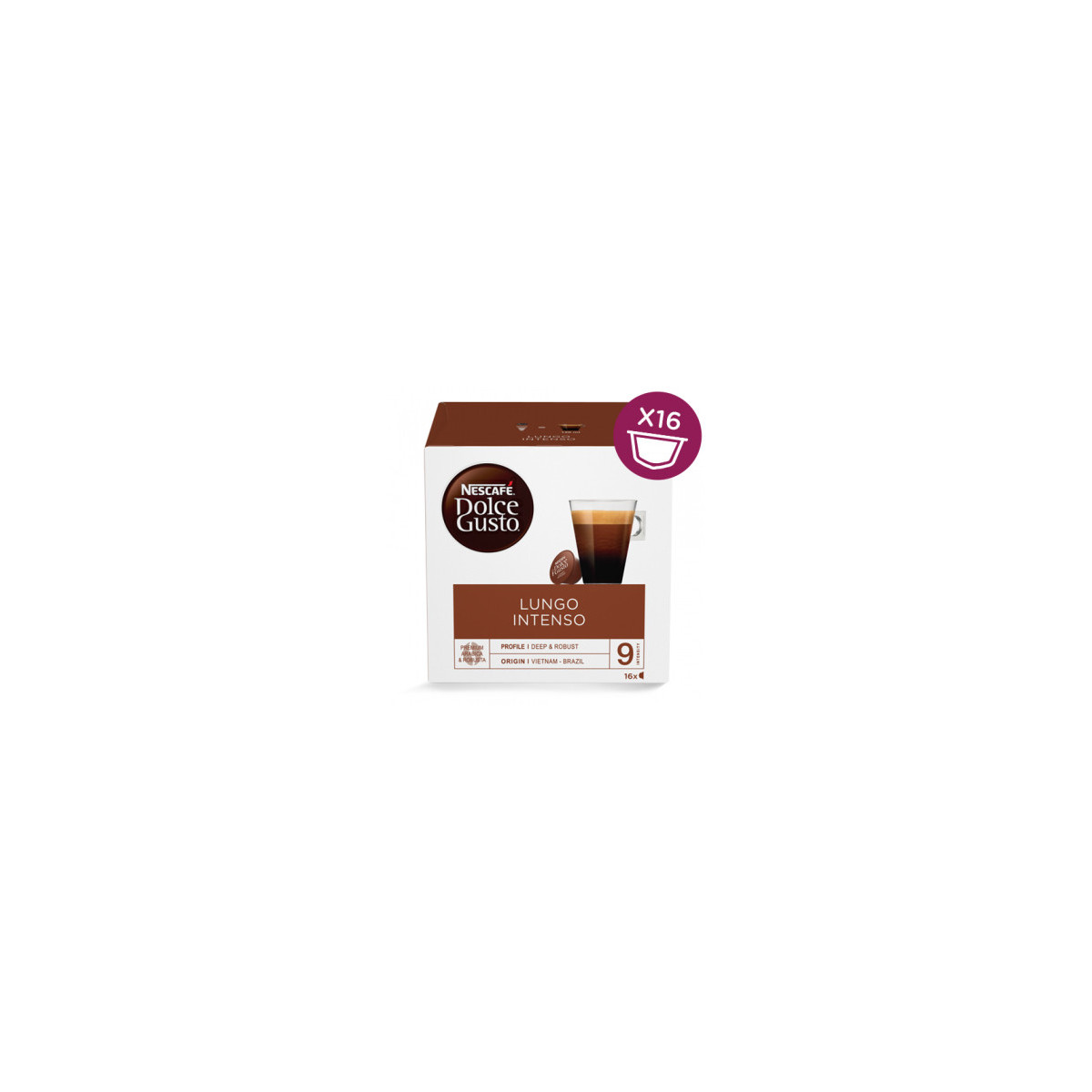 Nescafé Dolce Gusto Lungo Intenso. Tipo di prodotto: Capsule caffè, Tipologie di bevande: Lungo, Sistema caffè in capsule/cialde: Dolce Gusto. Tipo di imballo: Scatola. Quantità per pacco: 16 pz