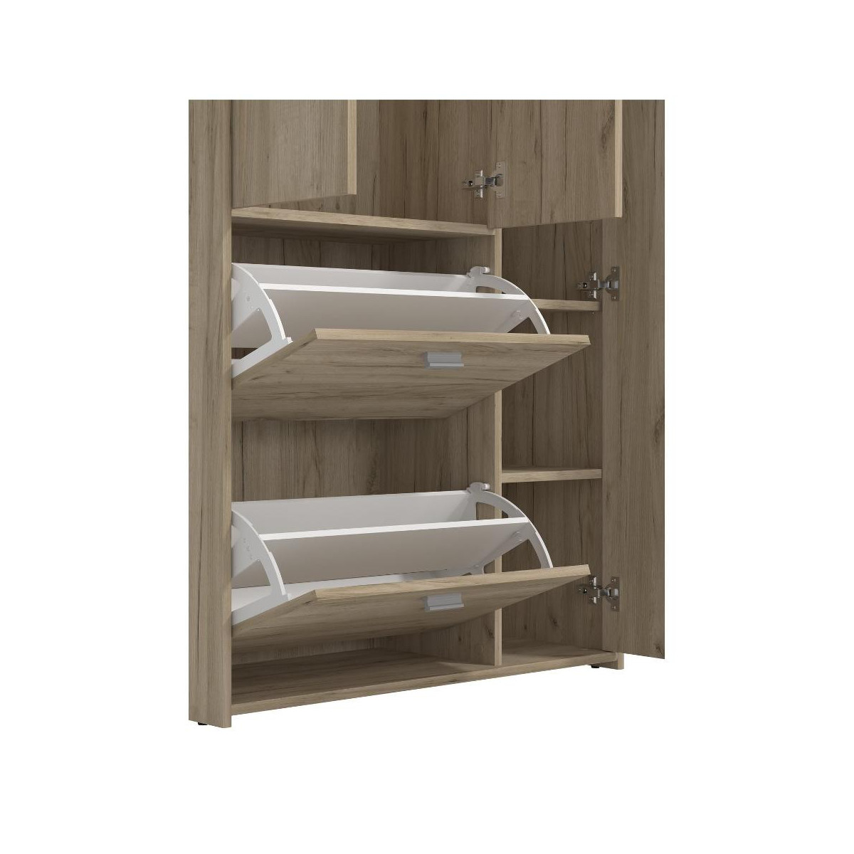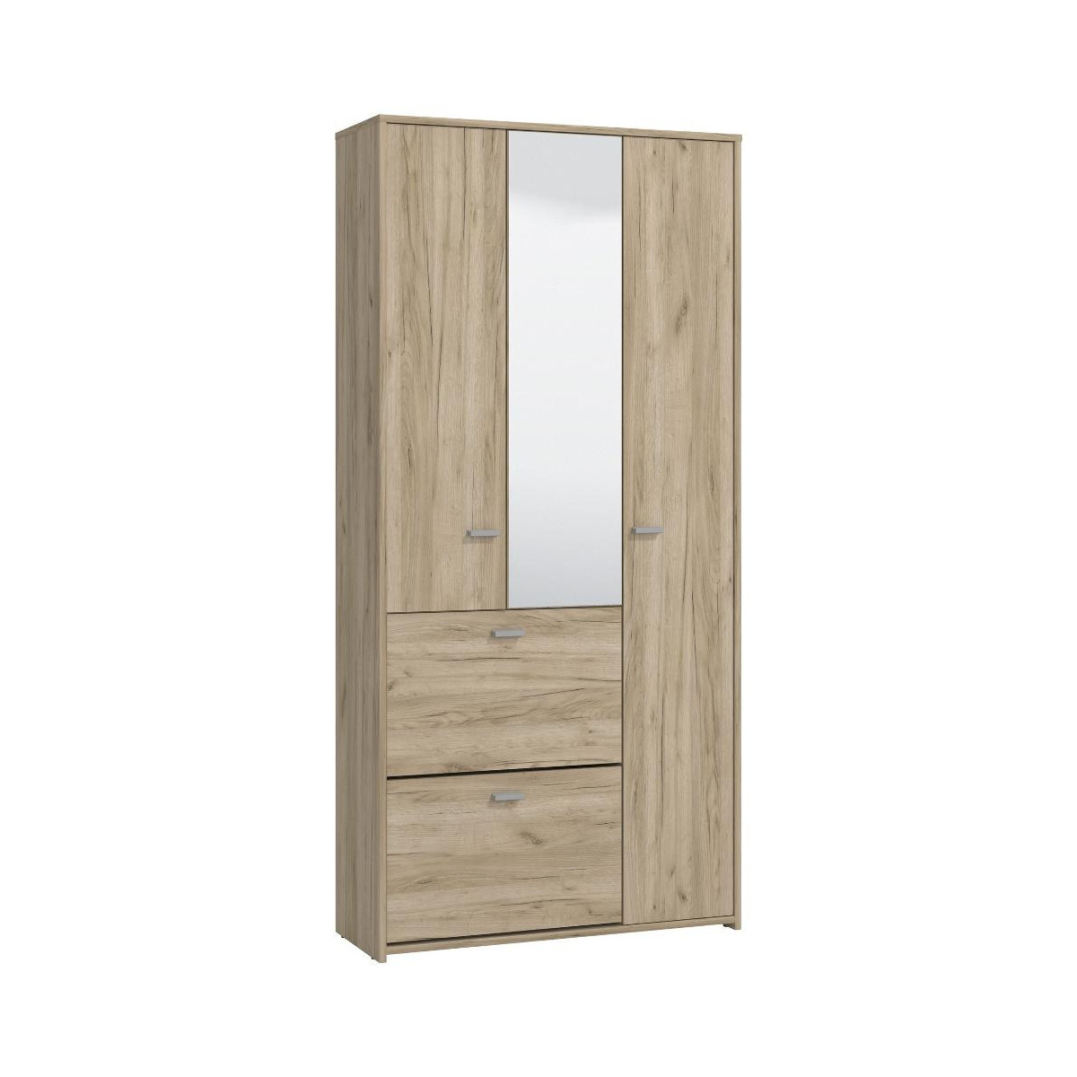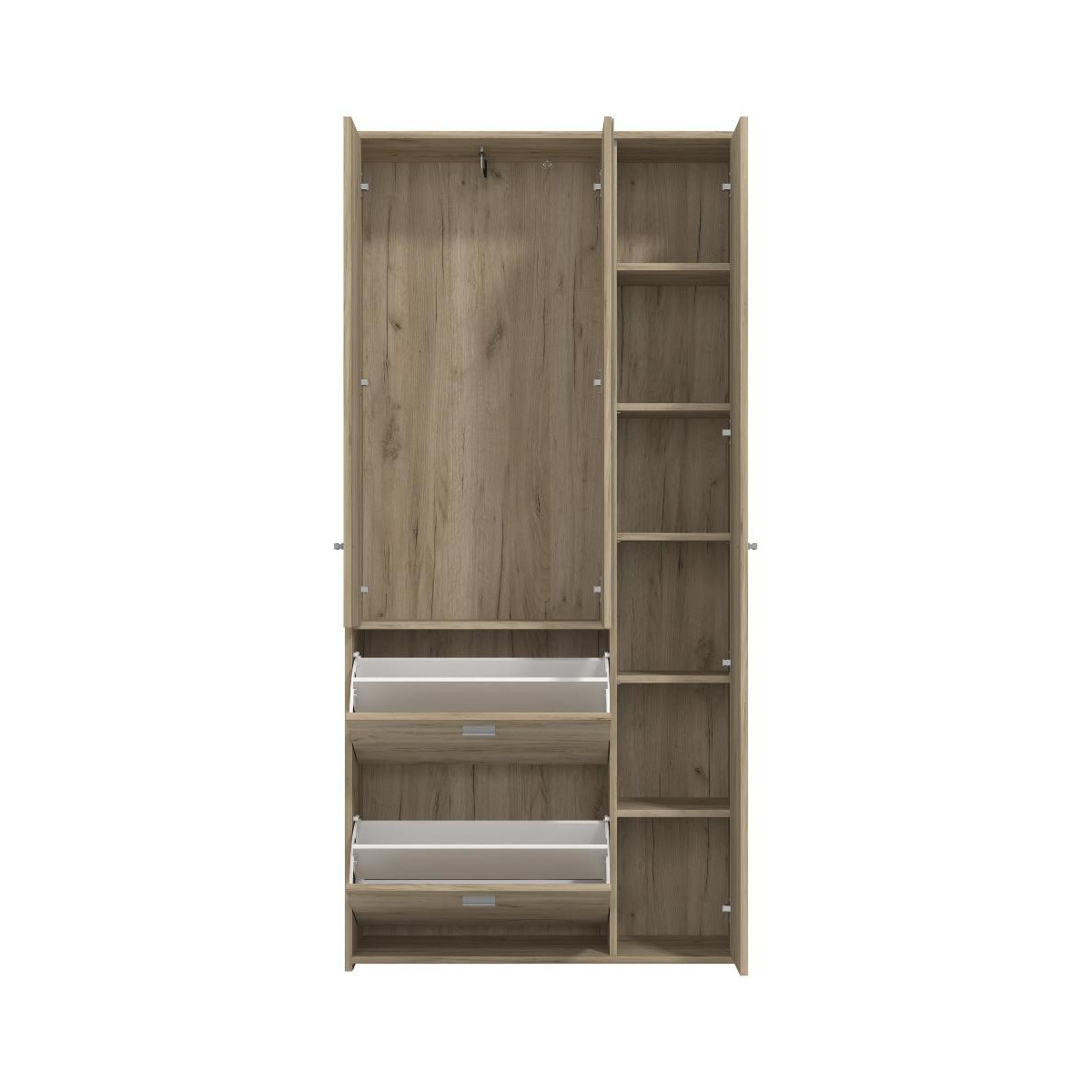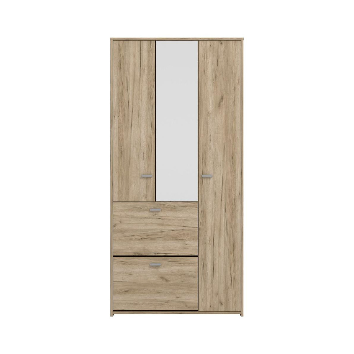 Composto da 3 ante battenti, 2 ante ribalta. Apertura mista, con maniglia. Frontale realizzato in truciolare, specchio. Struttura realizzata in truciolare. Completo di 5 ripiani, 1 appendiabiti, 2 scarpiere. Necessita di assemblaggio, istruzioni incluse. Indicazioni per la manutenzione incluse