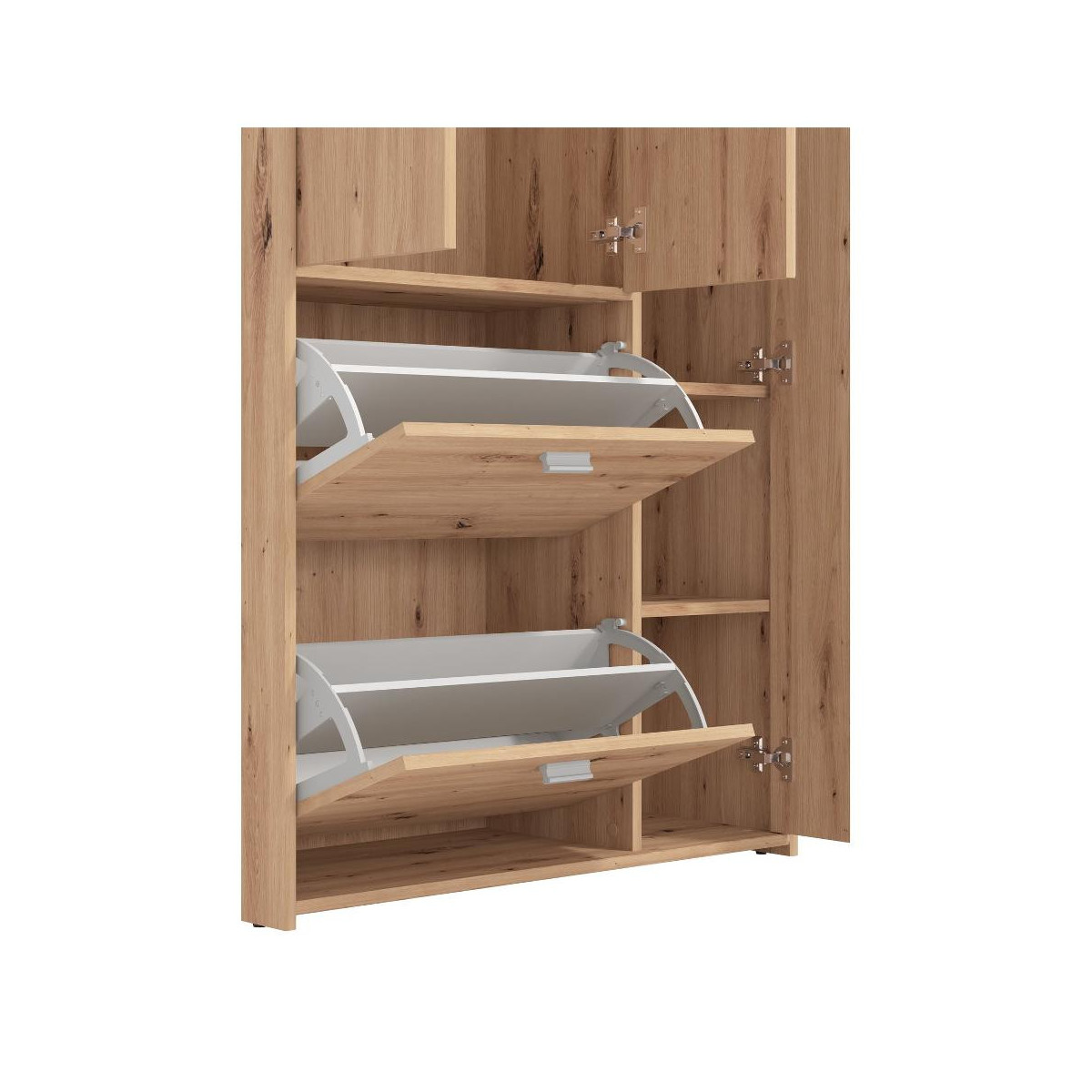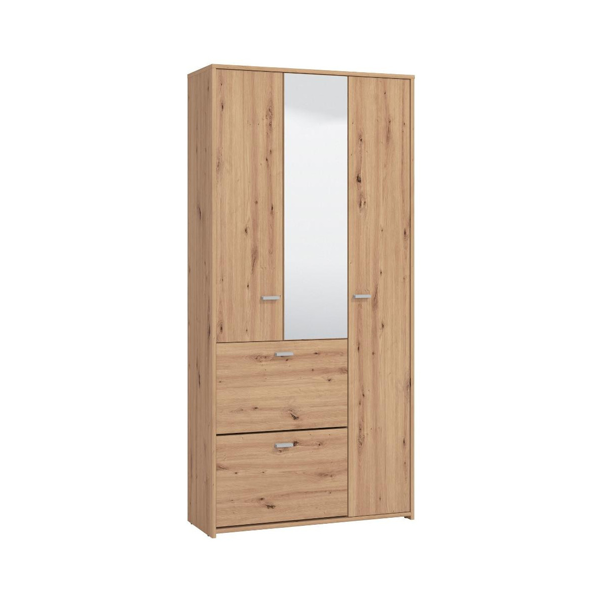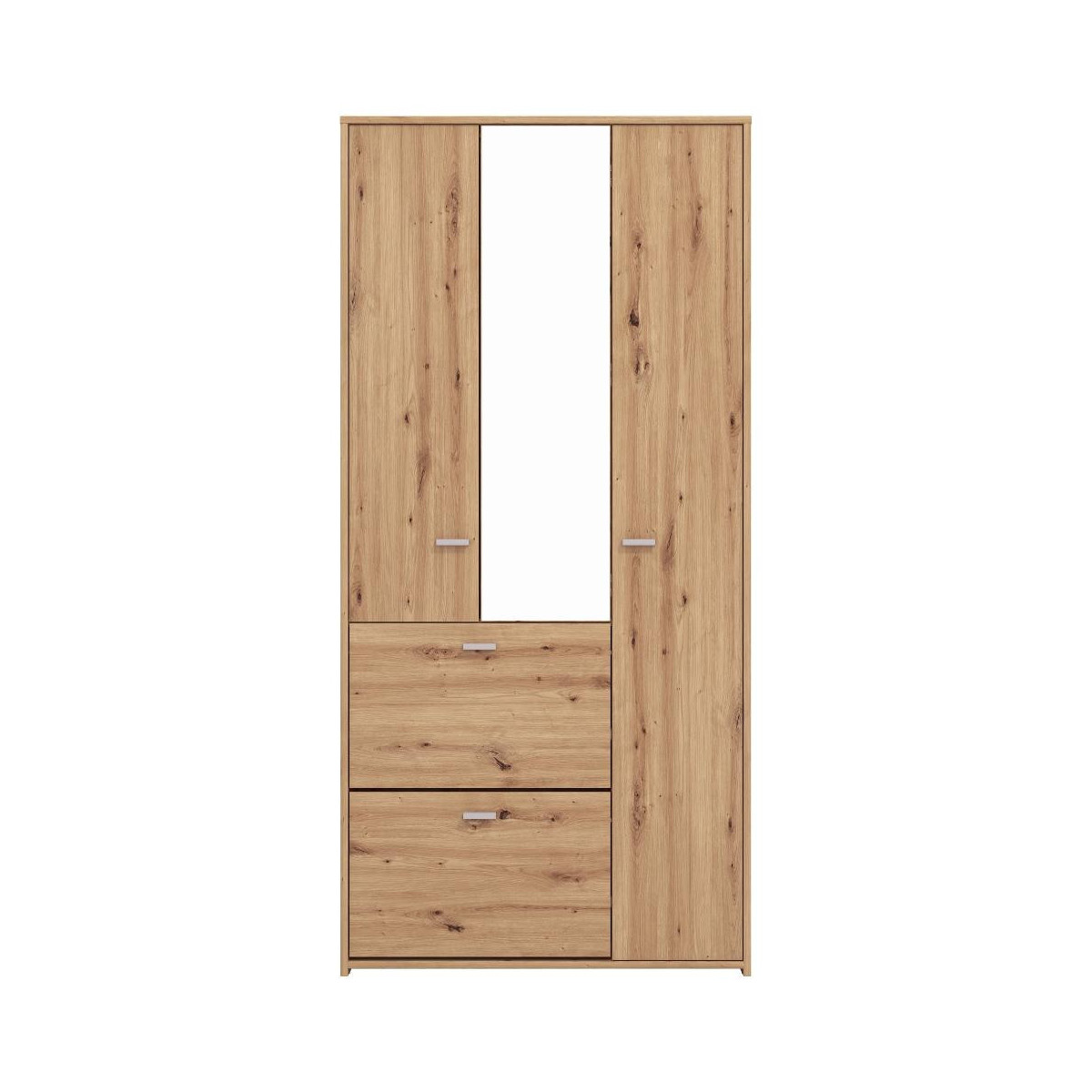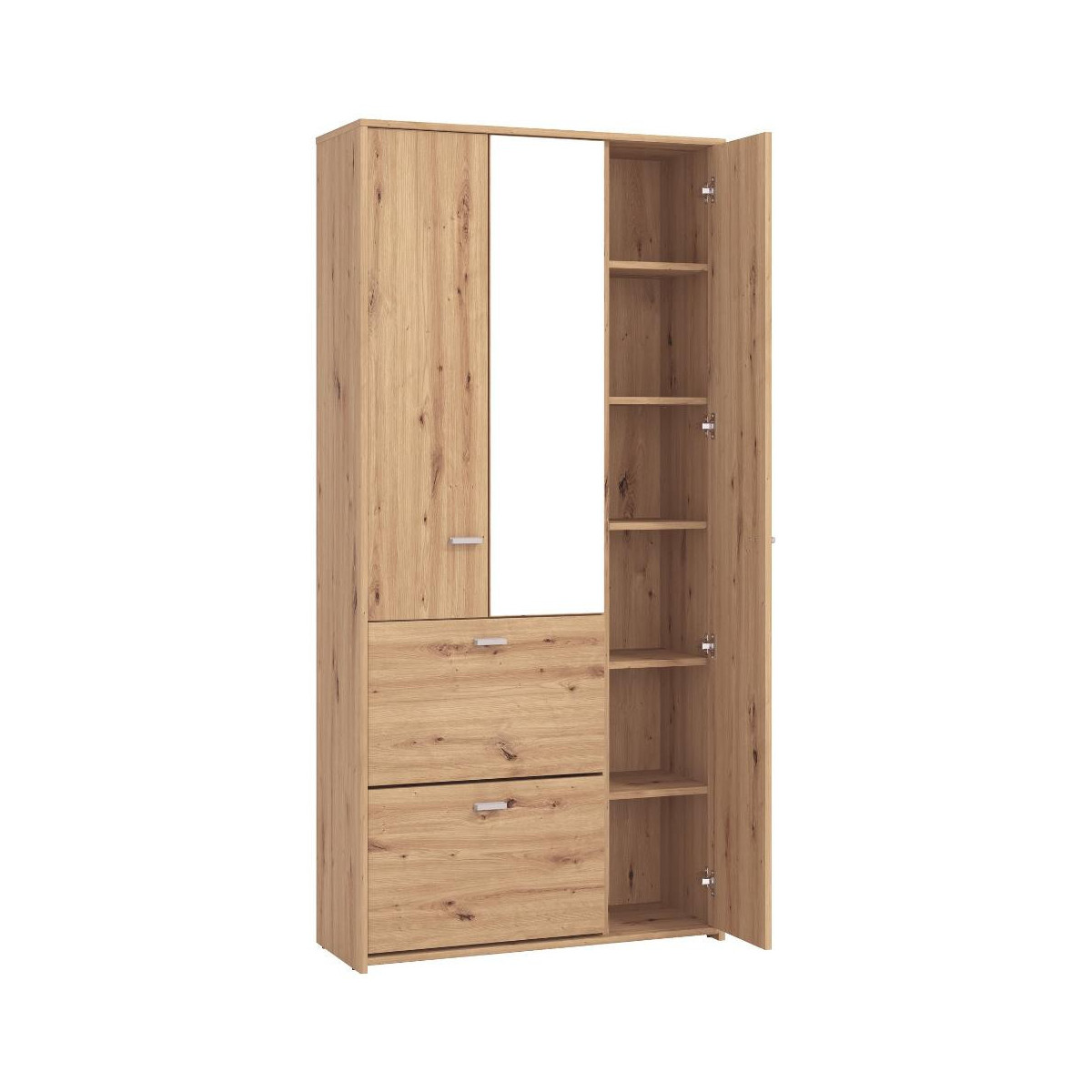Composto da 3 ante battenti, 2 ante ribalta. Apertura mista, con maniglia. Frontale realizzato in truciolare, specchio. Struttura realizzata in truciolare. Completo di 5 ripiani, 1 appendiabiti, 2 scarpiere. Necessita di assemblaggio, istruzioni incluse. Indicazioni per la manutenzione incluse