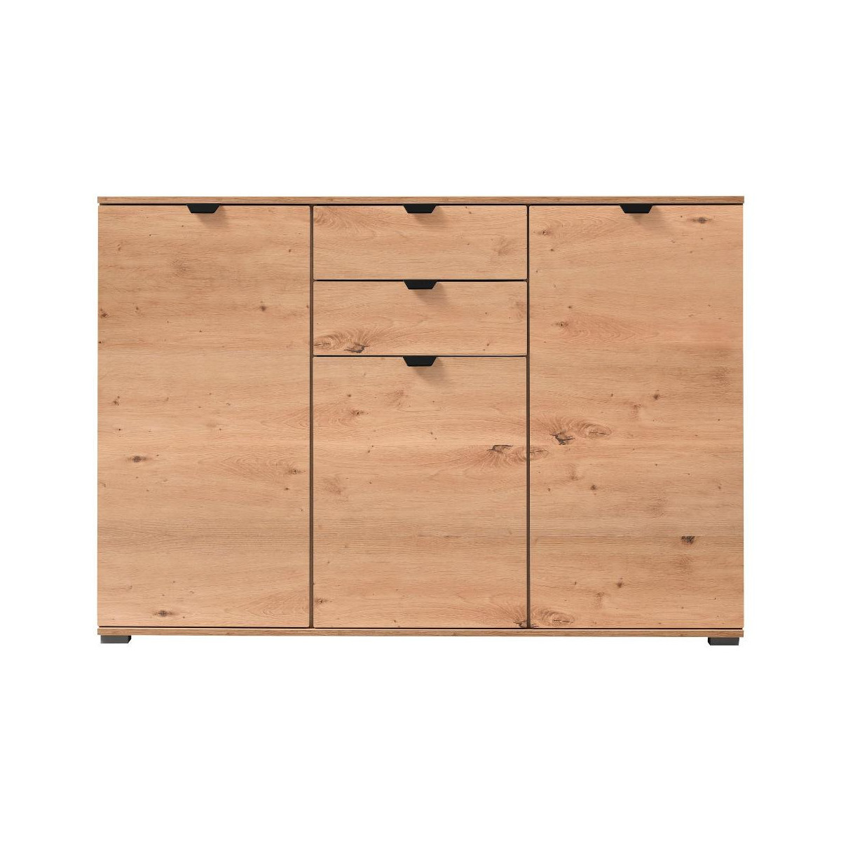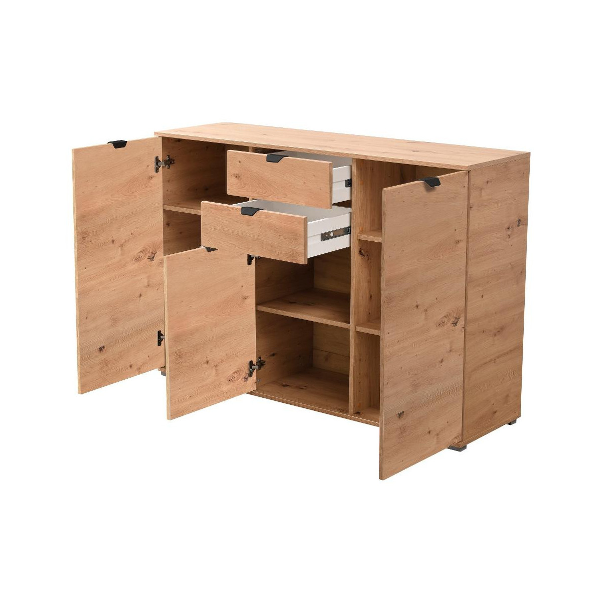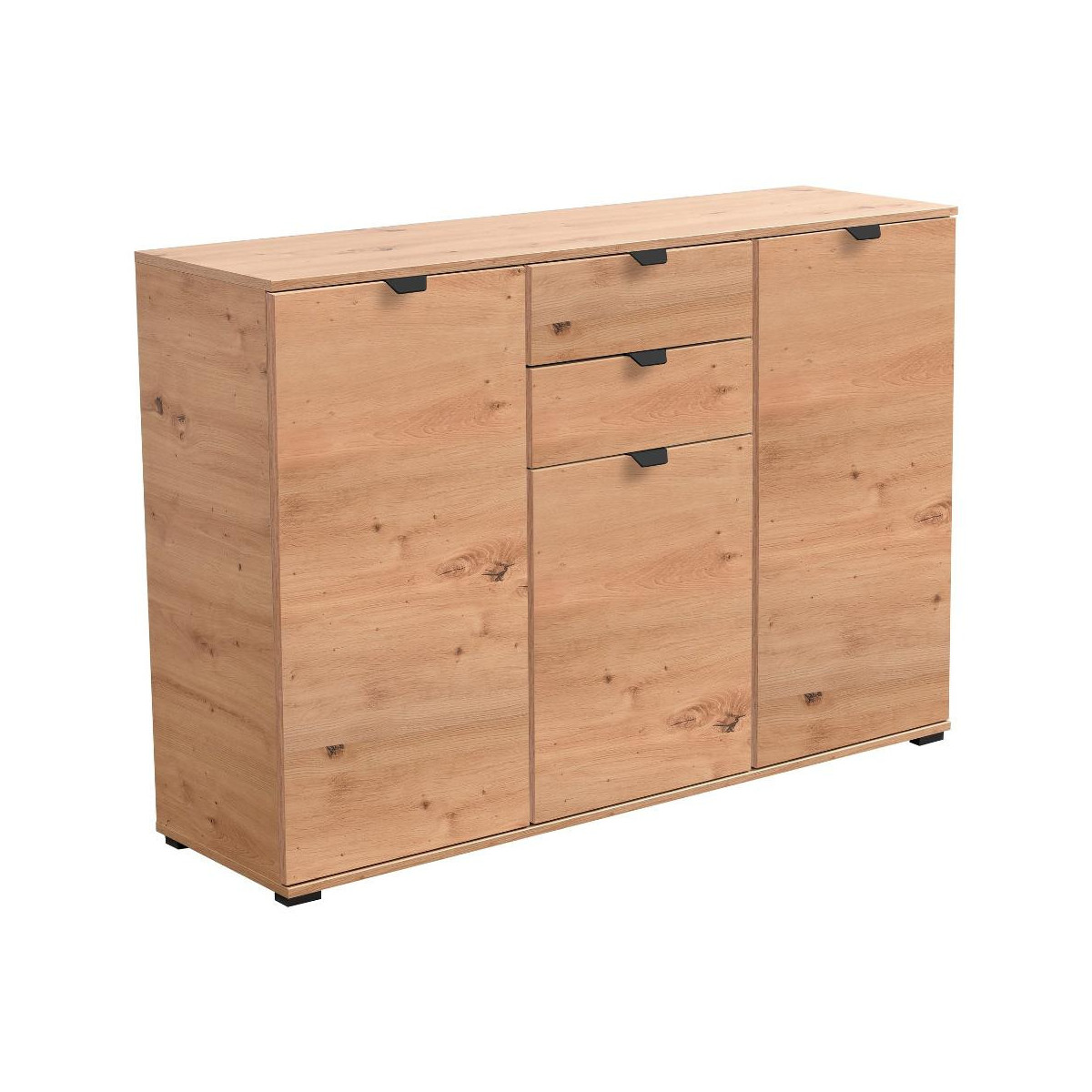 Composto da 3 ante battenti, 2 cassetti. Apertura mista, con maniglia. Frontale realizzato in truciolare. Struttura realizzata in truciolare. Completo di 5 ripiani. Posizionabile a terra. Necessita di assemblaggio, istruzioni incluse. Indicazioni per la manutenzione incluse