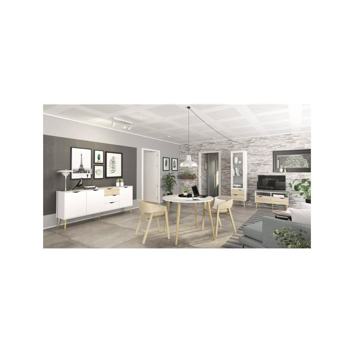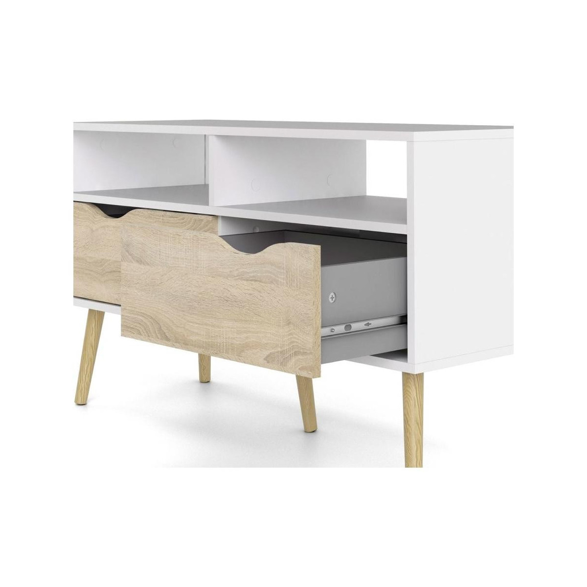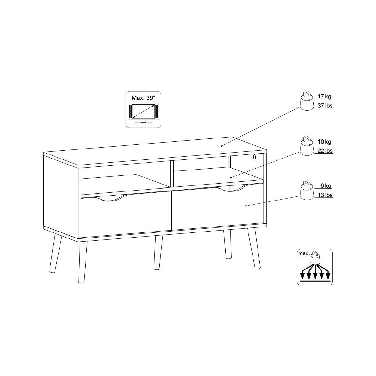Questa console multimediale della Collezione Oslo presenta due ripiani aperti e due cassetti con maniglie scanalate. Ideale per qualsiasi spazio Living può sostenere un televisore fino ad un max di 37" fornendo allo stesso tempo anche lo spazio per altri dispositivi di intrattenimento. La combinazione di colori chiari e ariosi di un top bianco nitido con gambe rotonde affusolate in rovere massiccio perfeziona questa fresca interpretazione del design della metà del secolo.
