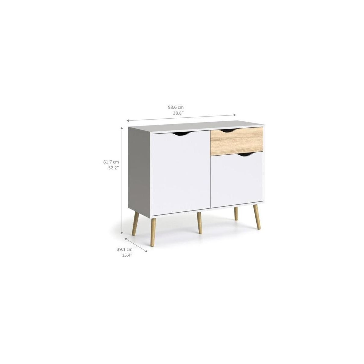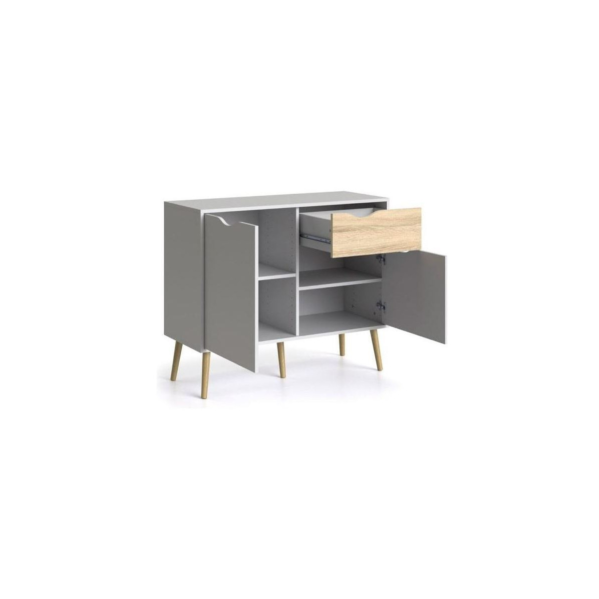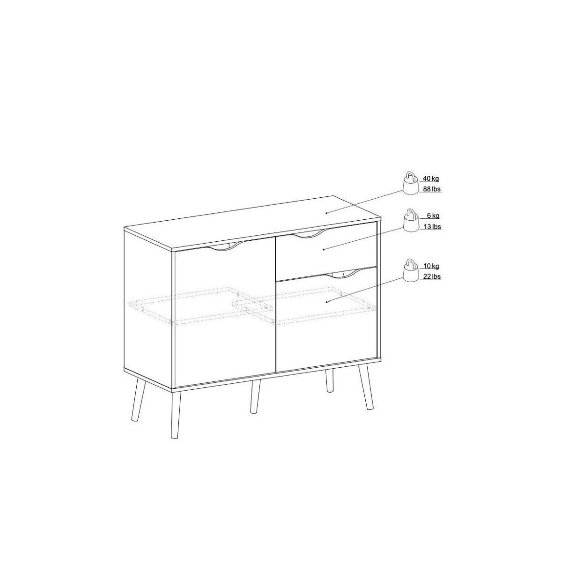 Mobile zona giorno Oslo con doppio vano e cassetto con maniglie scanalate. Ideale per qualsiasi ambiente offre un ampio spazio contenitivo. La combinazione del bianco e della finitura rovere e le gambe rotonde affusolate in rovere massiccio perfezionano questa fresca interpretazione del design della metà del secolo.