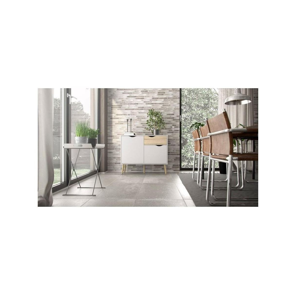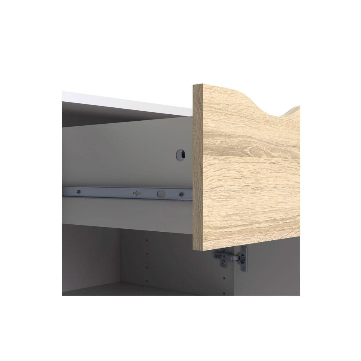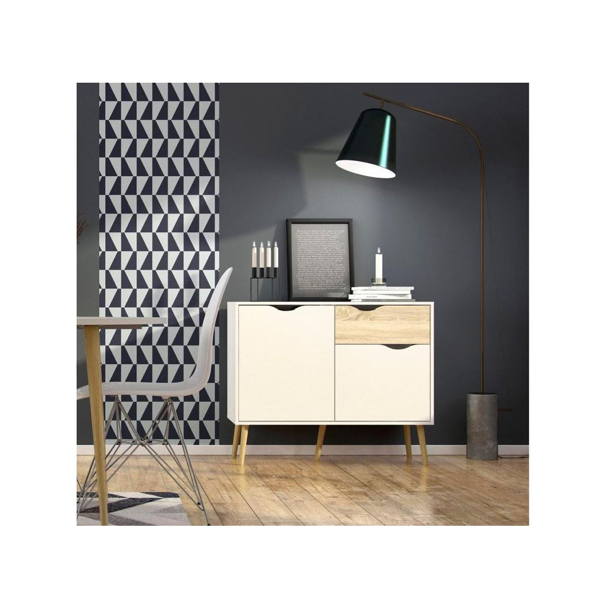 Mobile zona giorno Oslo con doppio vano e cassetto con maniglie scanalate. Ideale per qualsiasi ambiente offre un ampio spazio contenitivo. La combinazione del bianco e della finitura rovere e le gambe rotonde affusolate in rovere massiccio perfezionano questa fresca interpretazione del design della metà del secolo.