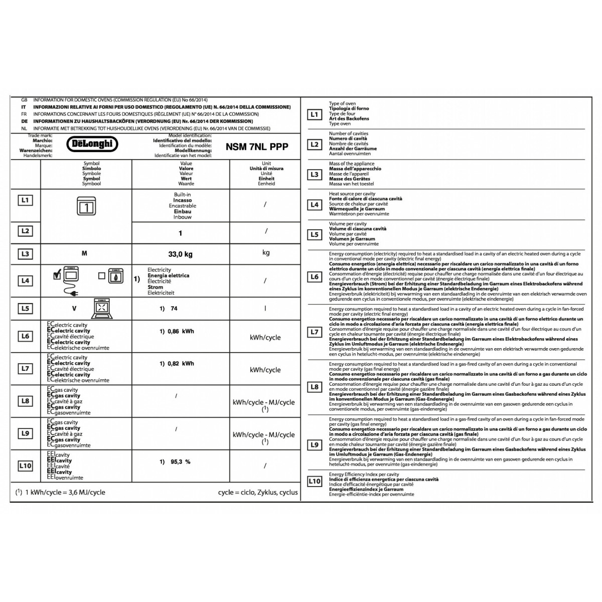 De’Longhi NSM 7NL PPP. Dimensione del forno: Media, Tipo di forno: Forno elettrico, Capacità interna forno totale: 74 L. Posizionamento dell'apparecchio: Da incasso, Colore del prodotto: Nero, Tipo di controllo: Manopola. Tipo di timer: Meccanico, Timer da 30 minuti: 120 min, Modalità di impostazione del timer: Tempo di fine cottura. Classe efficienza energetica: A, Consumo energetico (convenzionale): 0,86 kWh, Consumo energetico (convezione forzata): 0,82 kWh. Quantità lampade: 1 lampada(e), Tipo di lampada: Alogena