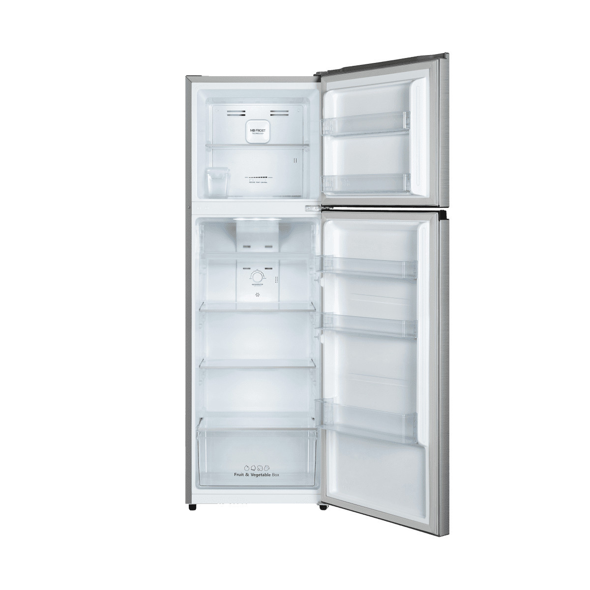 Hisense RT327N4ACF. Capacità netta totale: 249 L. Cerniera porta: Destra. Classe climatica: N-ST, Emissione acustica: 42 dB. Capacità netta frigorifero: 197 L, Luce interna, Numero di ripiani frigorifero: 5, Numero di cassetti per verdura: 1. Capacità netta congelatore: 52 L, Capacità di congelamento: 2 kg/24h. Classe efficienza energetica: F, Consumo energetico annuo: 241 kWh. Colore del prodotto: Metallico