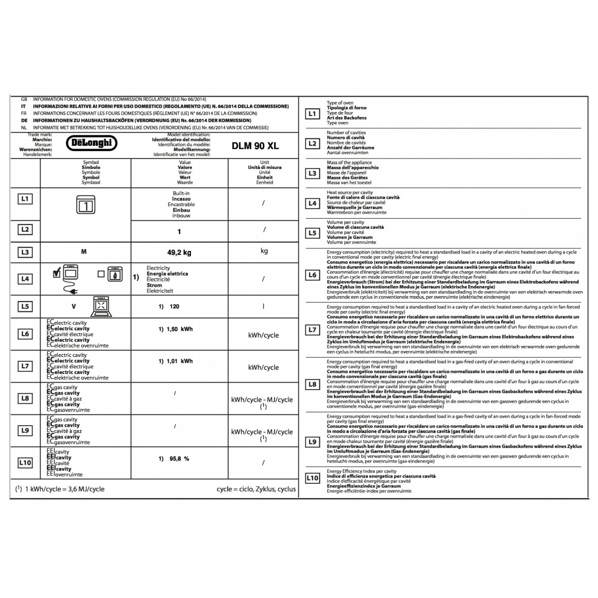 De’Longhi DLM 90 XL. Dimensione del forno: Largo, Tipo di forno: Forno elettrico, Capacità interna forno totale: 120 L. Posizionamento dell'apparecchio: Da incasso, Colore del prodotto: Acciaio inossidabile, Tipo di controllo: Manopola. Tipo di timer: Meccanico, Timer da 30 minuti: 120 min, Modalità di impostazione del timer: Tempo di fine cottura. Classe efficienza energetica: A, Consumo energetico (convenzionale): 1,5 kWh, Consumo energetico (convezione forzata): 1,01 kWh. Quantità lampade: 2 lampada(e), Tipo di lampada: Alogena