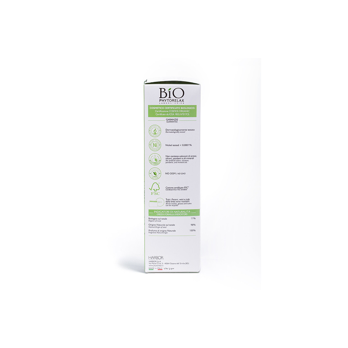 | Certificati di sostenibilità | COSMOS NATURAL ICEA, Forest Stewardship Council (FSC) |