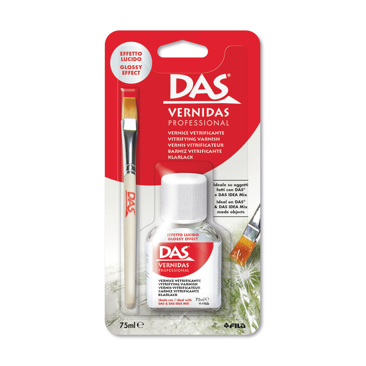 È una vernice vetrificante, trasparente e protettiva, con effetto lucido. A base solvente, essicca in circa 2 ore. È adatta a tutte le superfici ed è ideale su oggetti realizzati con DAS, esaltando gli effetti marmorizzati creati con DAS IDEA MIX. Il flacone è dotato di uno speciale tappo di sicurezza e la confezione include un pennello in fibra sintetica ideale per l’applicazione della vernice e di facile pulizia con alcool.