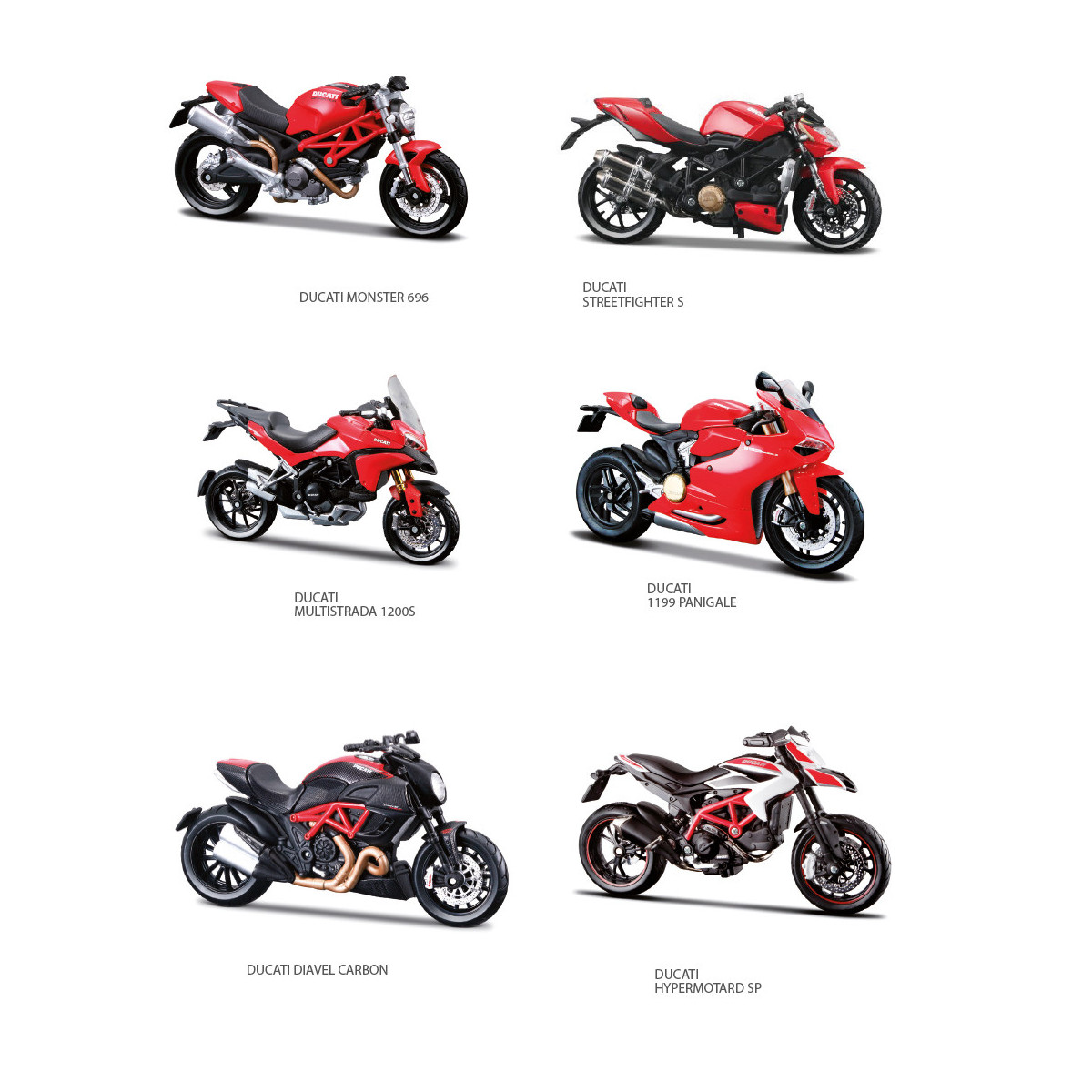 | Nome originale del modello | Ducati Multistrada 1200 S, Ducati Monster 696, Ducati Hypermotard SP 2013, Ducati Diavel Carbon, Ducati Streetfighter S, Ducati 1199 Panigale |