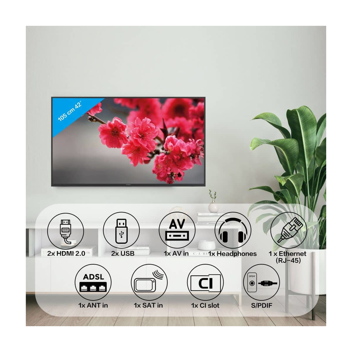 Strong SRT42FC5433U. Dimensioni schermo: 106,7 cm (42"), Risoluzione del display: 1920 x 1080 Pixel, Tipologia HD: Full HD, Forma dello schermo: Piatto. Smart TV. Luminosità schermo: 240 cd/m², Tempo di risposta: 8 ms, Rapporto di contrasto: 3000:1. Formato del segnale digitale: DVB-C,DVB-S2,DVB-T2. Wi-Fi, Collegamento ethernet LAN. Colore del prodotto: Nero, Argento