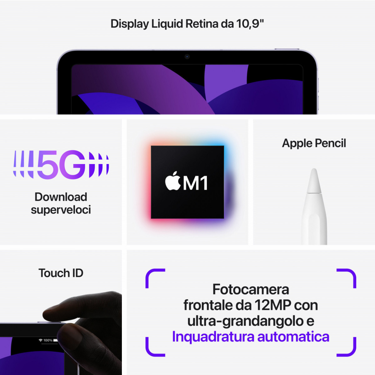 Apple iPad Air 10.9'' Wi-Fi + Cellular 256GB - Grigio siderale. Dimensioni schermo: 27,7 cm (10.9"), Risoluzione del display: 2360 x 1640 Pixel, Tecnologia display: LED. Capacità memoria interna: 256 GB. Famiglia processore: Apple M, Modello del processore: M1. RAM installata: 8 GB. Risoluzione fotocamera posteriore (numerico): 12 MP, Tipo di fotocamera posteriore: Fotocamera singola, Risoluzione fotocamera frontale (numerico): 12 MP, Fotocamera frontale. Wi-Fi standard: Wi-Fi 6 (802.11ax). Peso: 462 g. Sistema operativo incluso: iPadOS 15. Colore del prodotto: Grigio