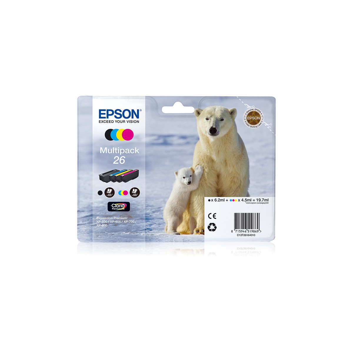 Epson Polar bear Multipack 26 (4 colori: NCMG). Tipo: Originale, Tipo di inchiostro: Inchiostro a base di pigmento, Colori di stampa: Nero, Ciano, Magenta, Giallo. Larghezza: 141,8 mm, Profondità: 45 mm, Altezza: 192 mm. Ampiezza del pallet: 80 cm, Lunghezza del pallet: 120 cm, Altezza del pallet: 42 cm