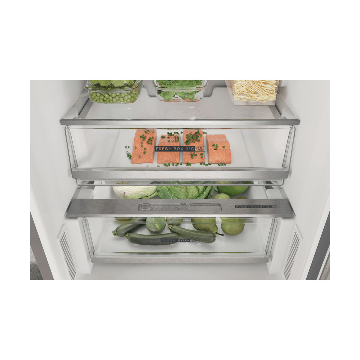 Whirlpool W7X 83A OX. Capacità netta totale: 335 L. Cerniera porta: Destra. Classe climatica: SN-T, Emissione acustica: 34 dB. Capacità netta frigorifero: 231 L, No Frost (frigorifero), Luce interna, Numero di ripiani frigorifero: 3. Capacità netta congelatore: 104 L, Capacità di congelamento: 11 kg/24h, No Frost (congelatore). Compartimento zona fresca. Classe efficienza energetica: D, Consumo energetico annuo: 201 kWh. Colore del prodotto: Acciaio inossidabile