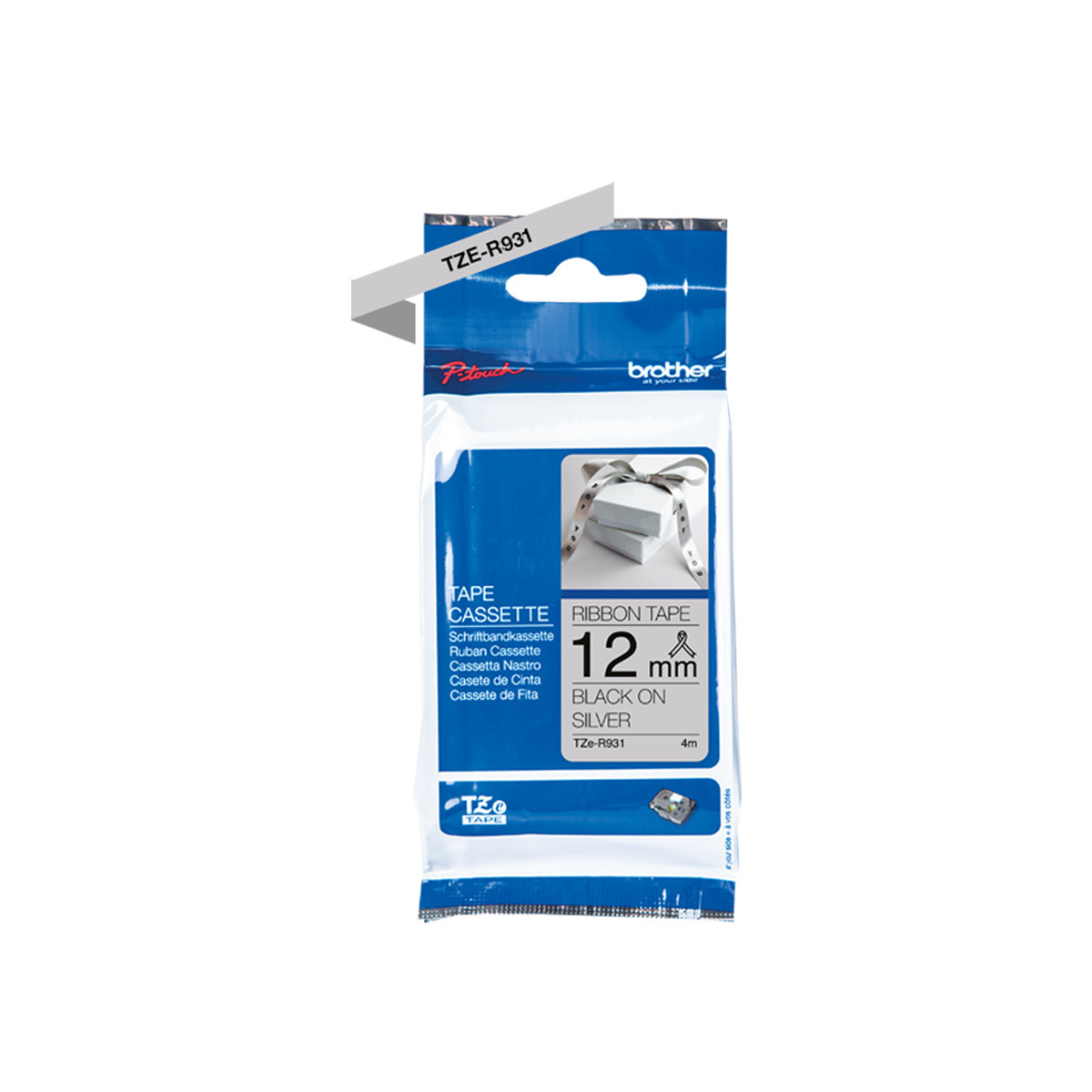 Brother TZE-R931. Colori di stampa: Nero, Colore del prodotto: Argento, Compatibilità marca: Brother. ampiezza del nastro: 1,2 cm, Lunghezza del nastro: 4 m. Tipo di imballo: Blister, Quantità per pacco: 1 pz