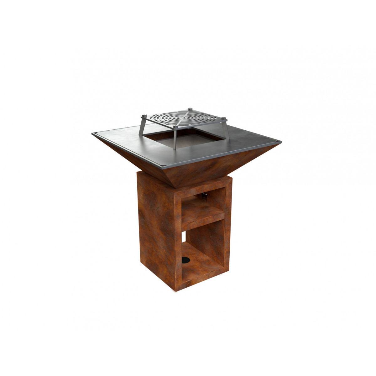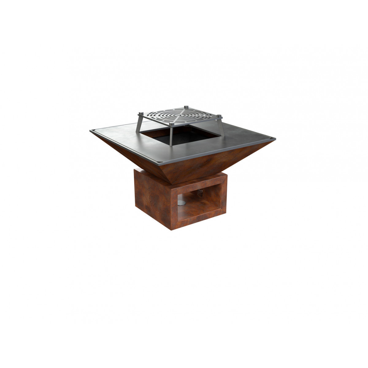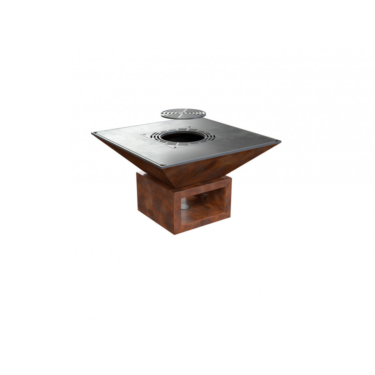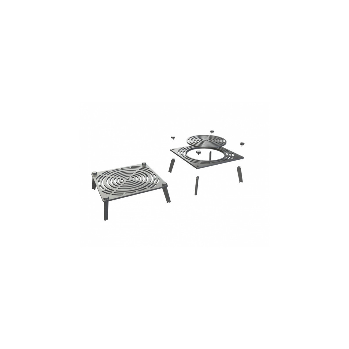 Griglia in ghisa per grigliata diretta. Inserto centrale rimovibile per cottura con pentola. Regolabile in altezza