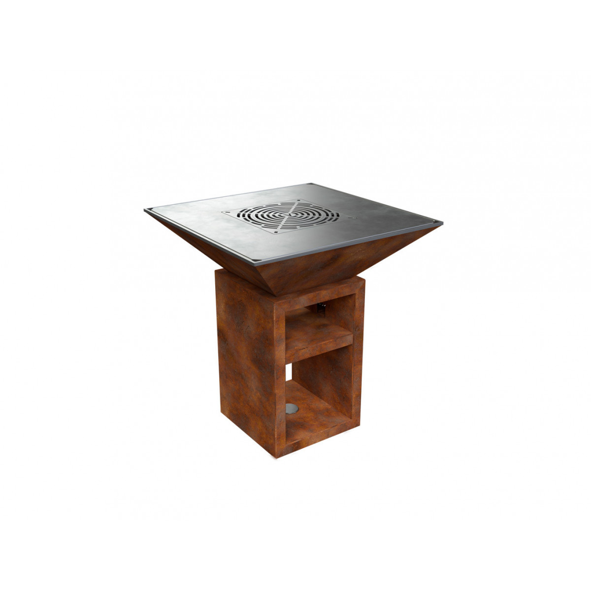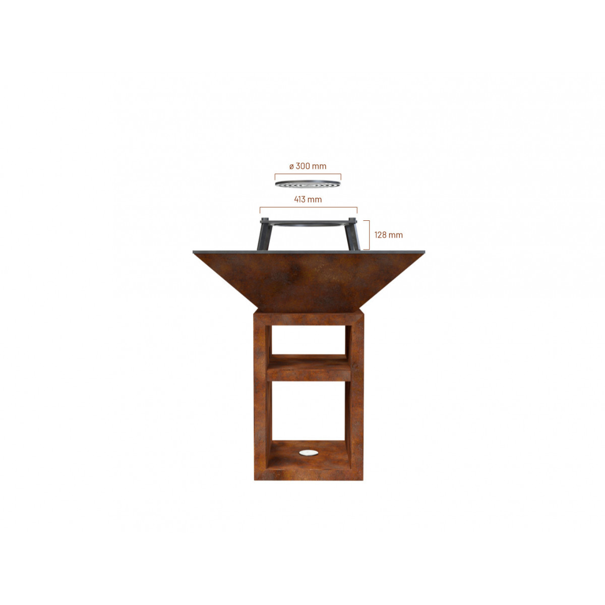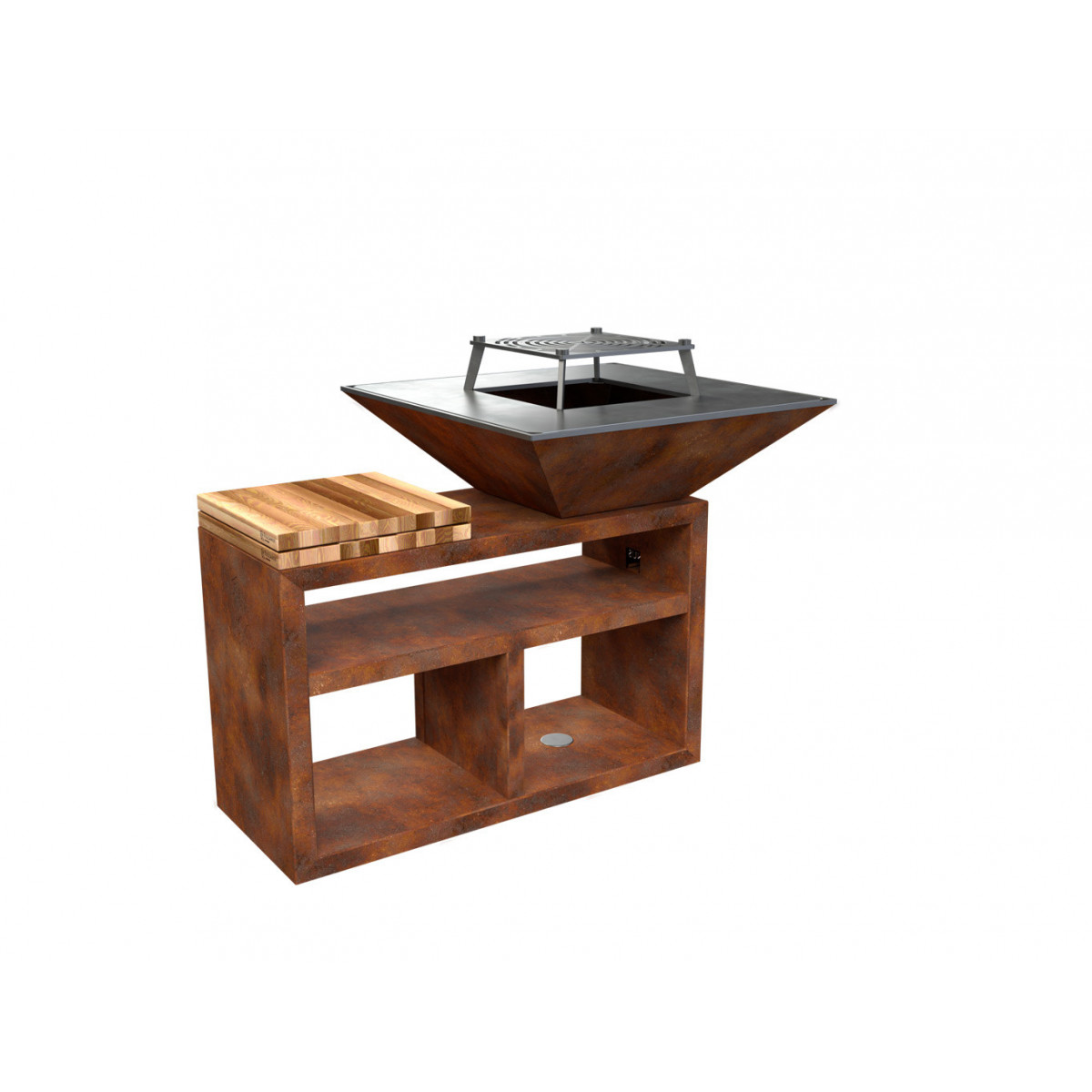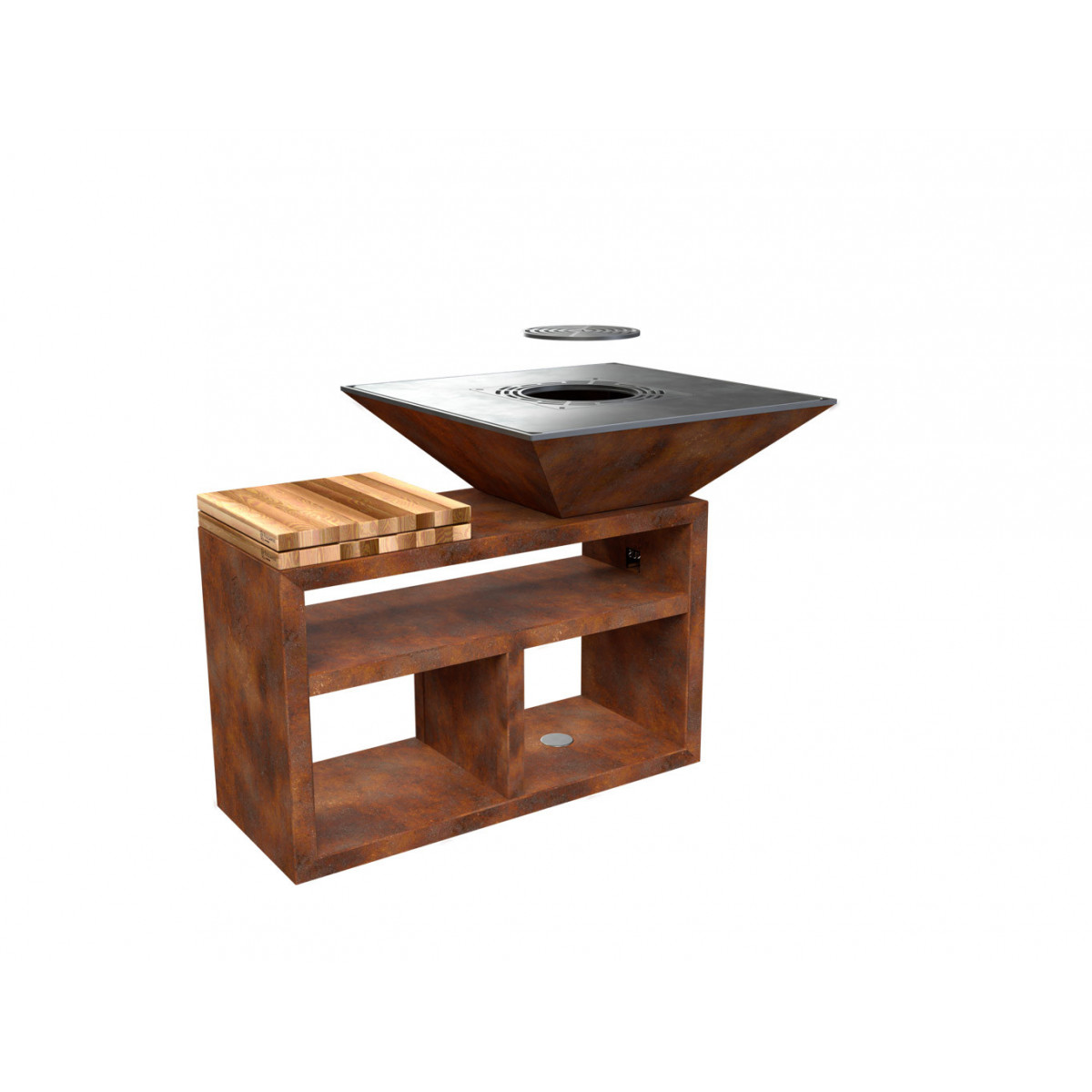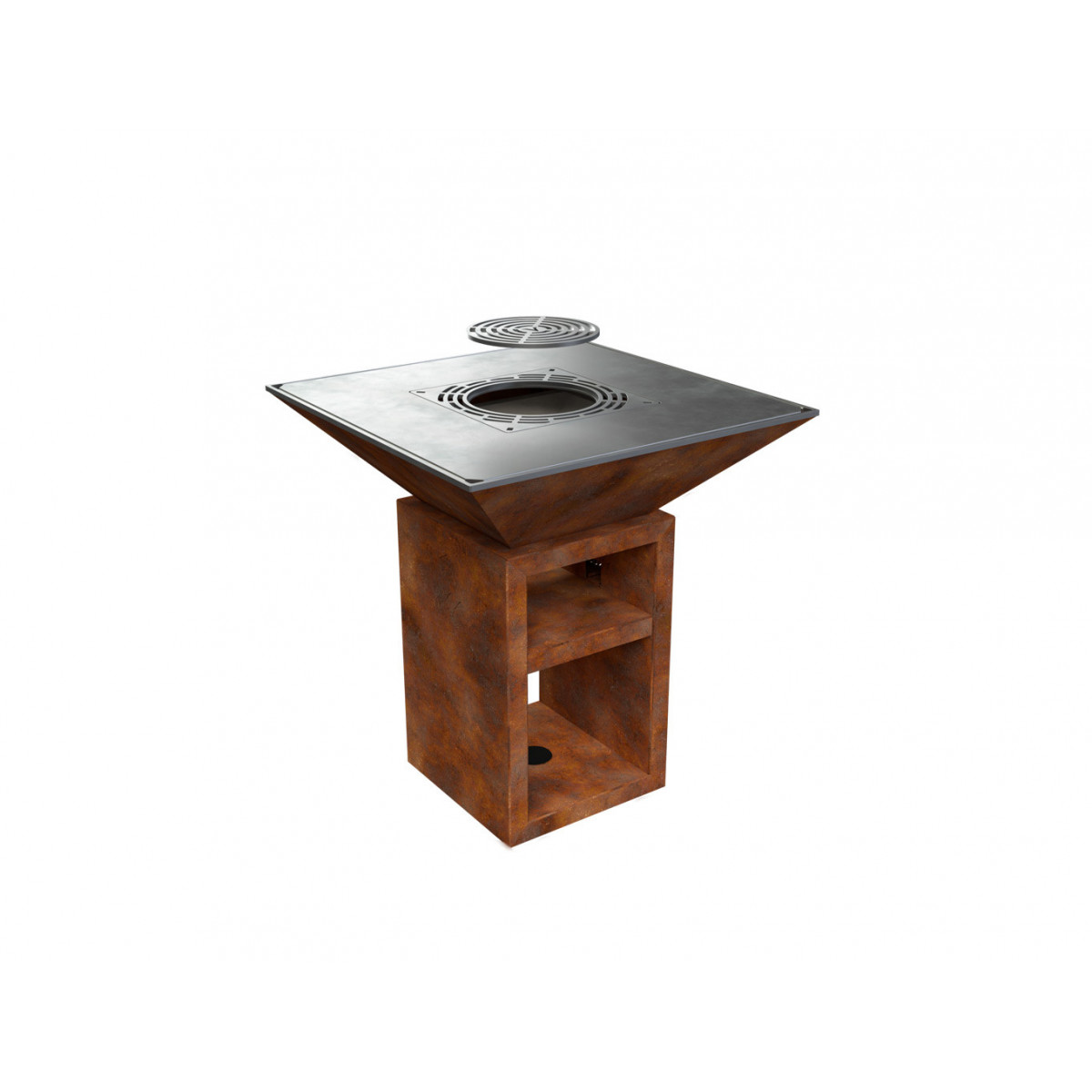 Griglia in ghisa per grigliata diretta. Inserto centrale rimovibile per cottura con pentola. Regolabile in altezza