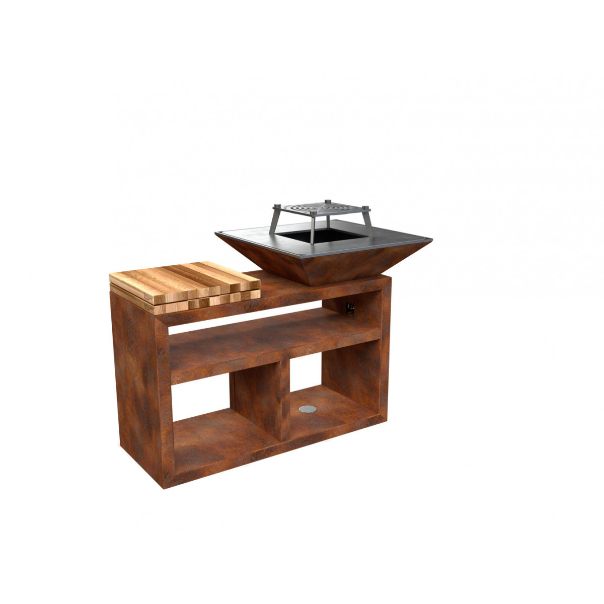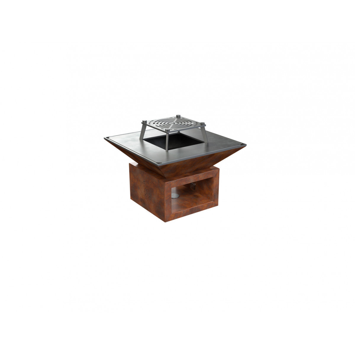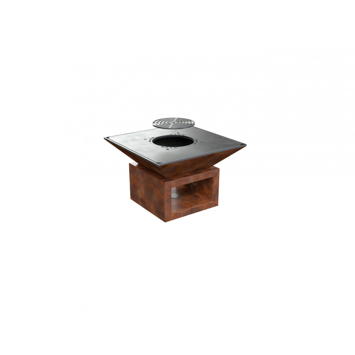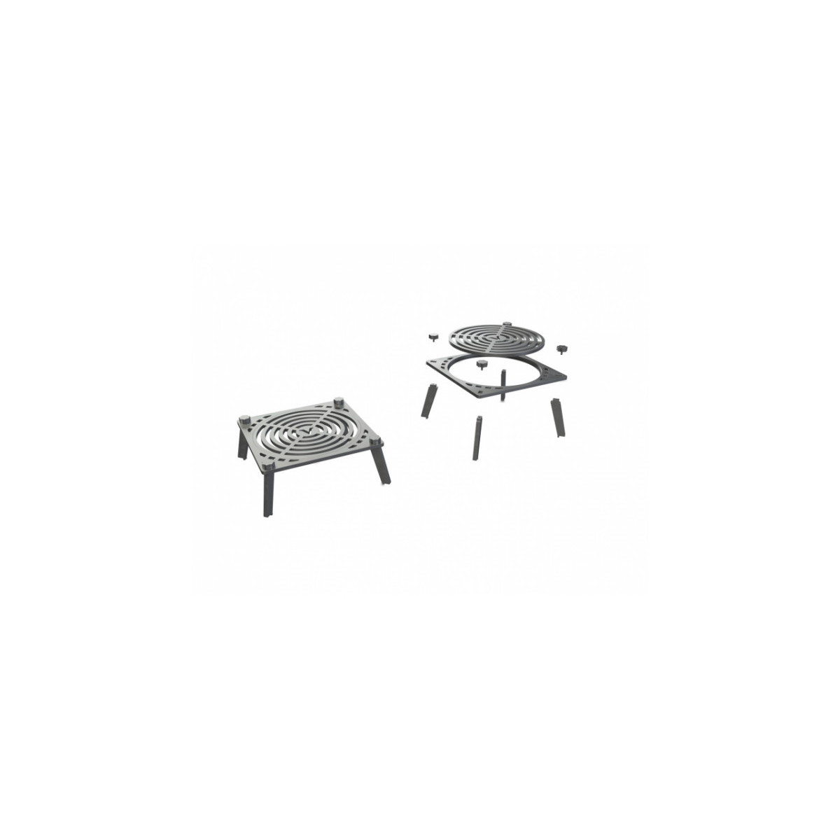 Griglia in ghisa per grigliata diretta. Inserto centrale rimovibile per cottura con pentola. Regolabile in altezza