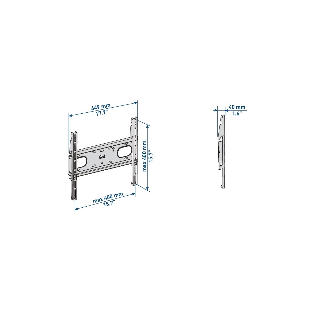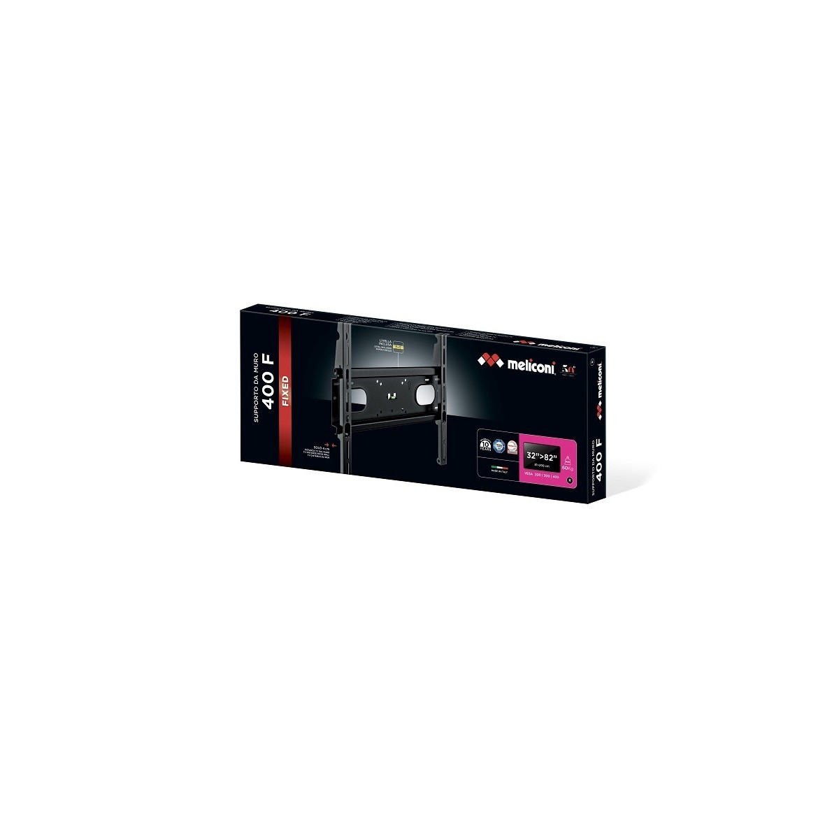 Meliconi SLIMSTYLE 400F. Peso massimo (capacità): 60 kg, Capienza minima dimensioni dello schermo: 81,3 cm (32"), Capienza massima dimensioni dello schermo: 2,03 m (80"), Compatibilità interfaccia di montaggio (min): 200 x 200 mm, Compatibilità interfaccia di montaggio (max): 400 x 400 mm. Distanza dalla parete (min): 2 cm. Colore del prodotto: Nero