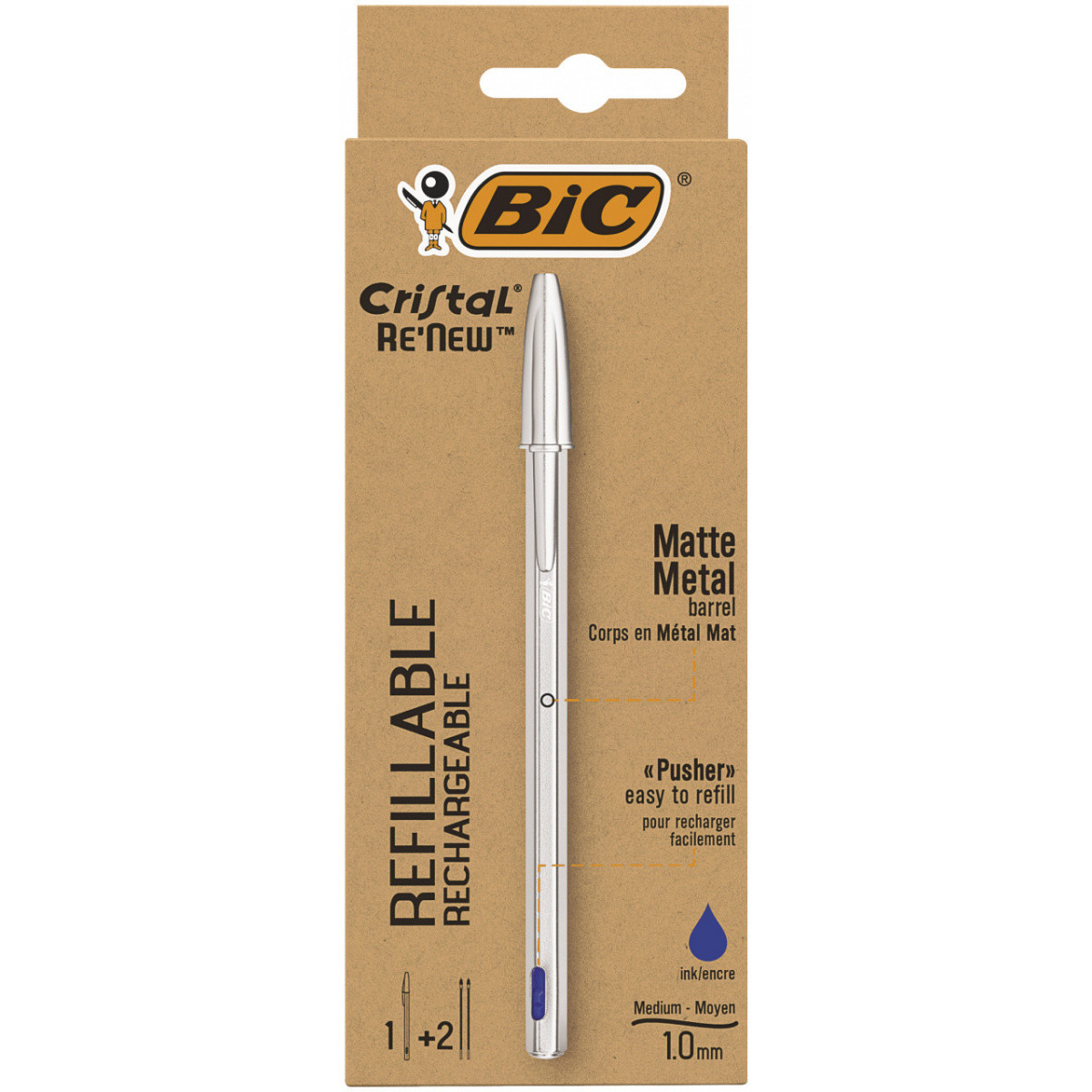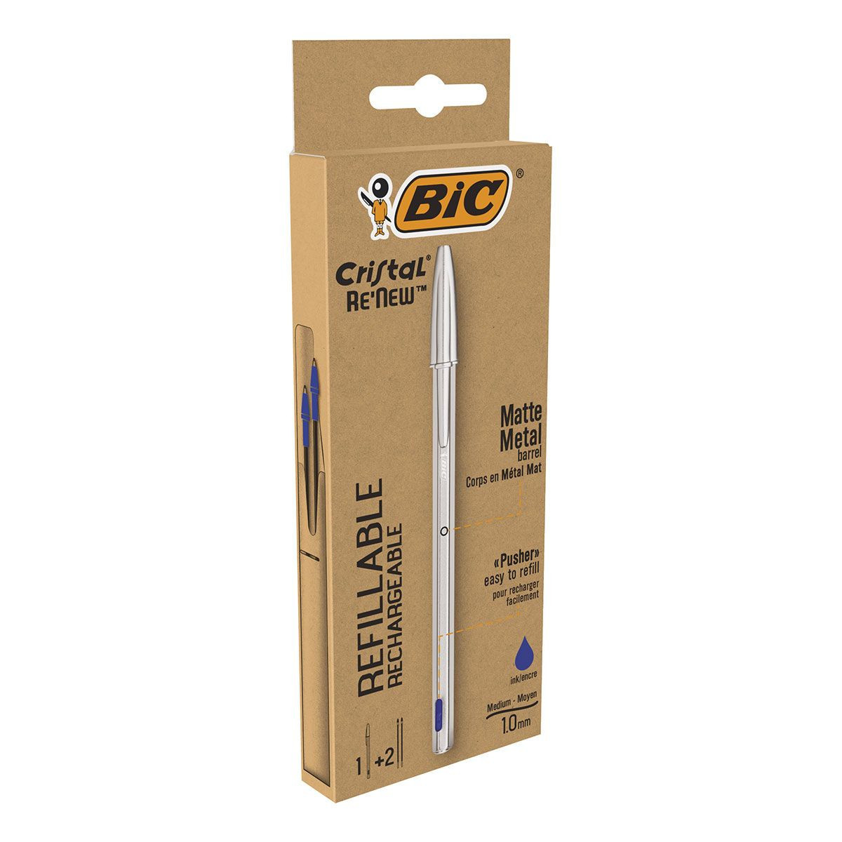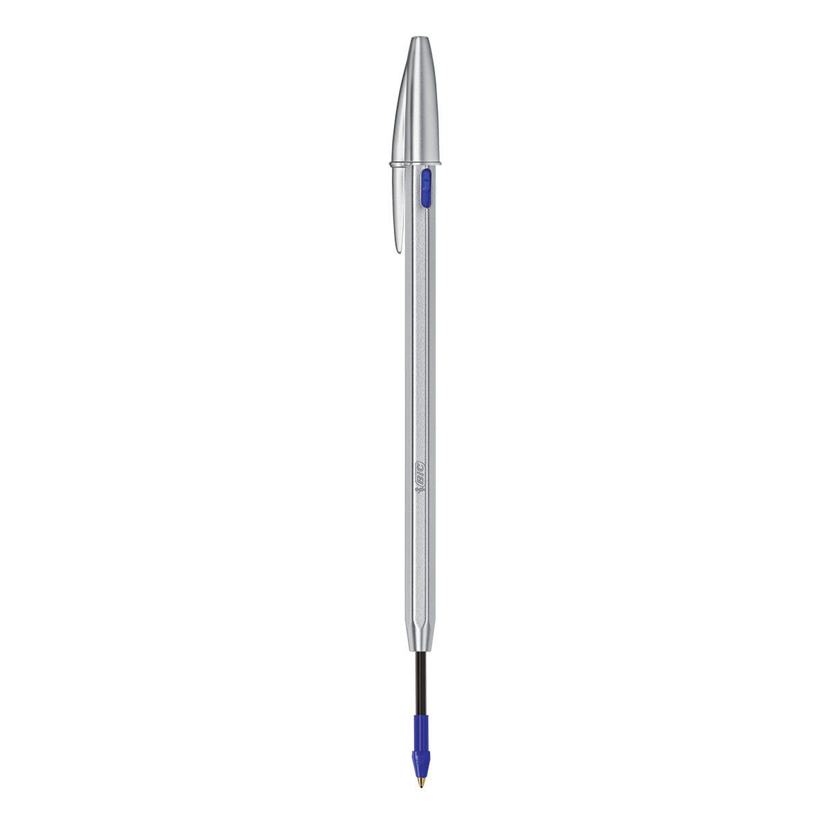 BIC Cristal Re'New, Penna Ricaricabile Blu a Sfera, Fusto in Metallo (Punta 1mm), Confezione 1 Penna + 2 Ricariche. Colore del prodotto: Argento, Colore penna: Blu, Tipo: Penna a sfera. Quantità per pacco: 1 pz, Tipo di imballo: Scatola