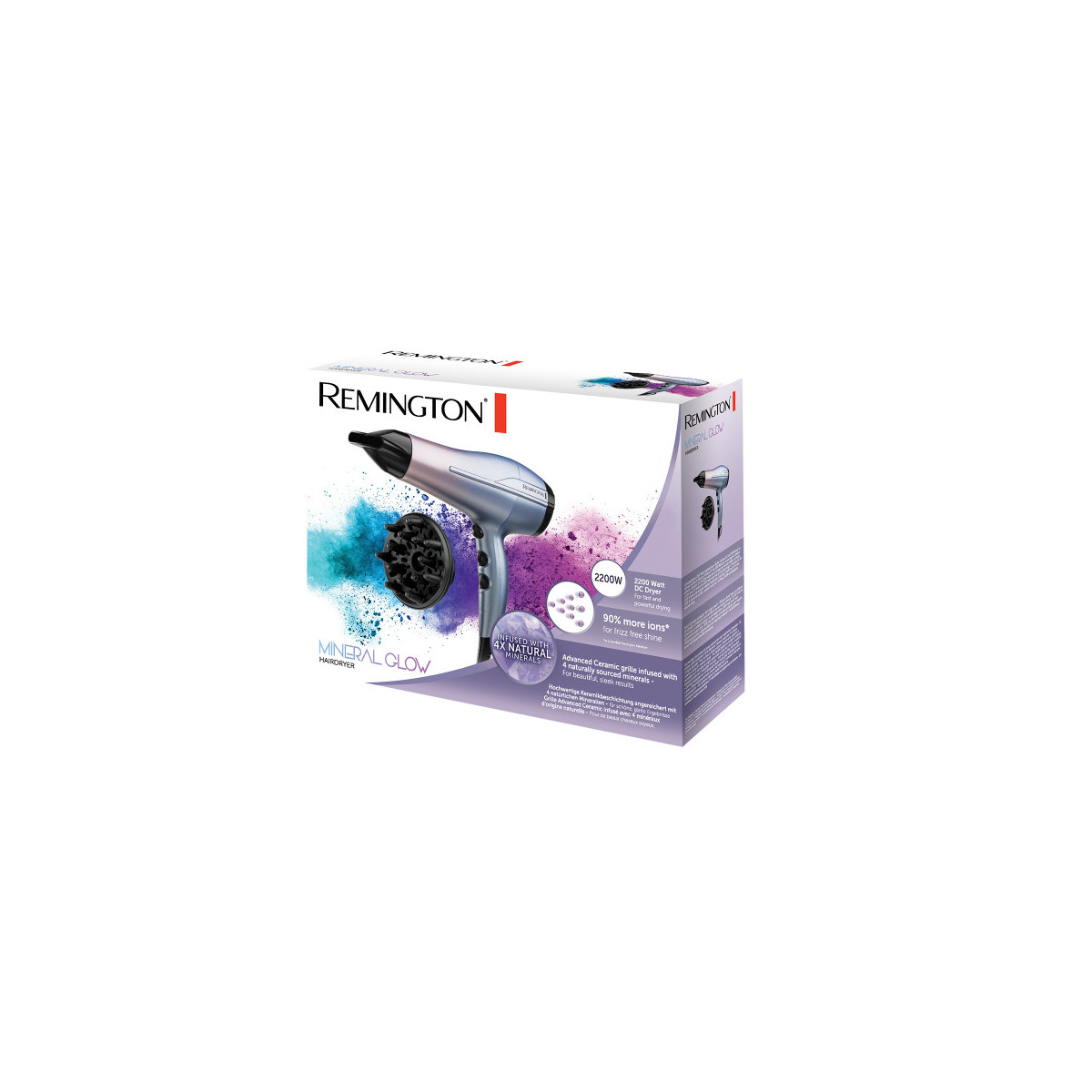 Dotato di griglia interna in ceramica di ultima generazione infusa con 4 minerali - Quarzo, Tormalina, Opale, Pietra di Luna - l'asciugacapelli Mineral Glow renderà i tuoi capelli luminosi e perfettamente lisci. Sensuale finitura lilla e azzurro pastello.