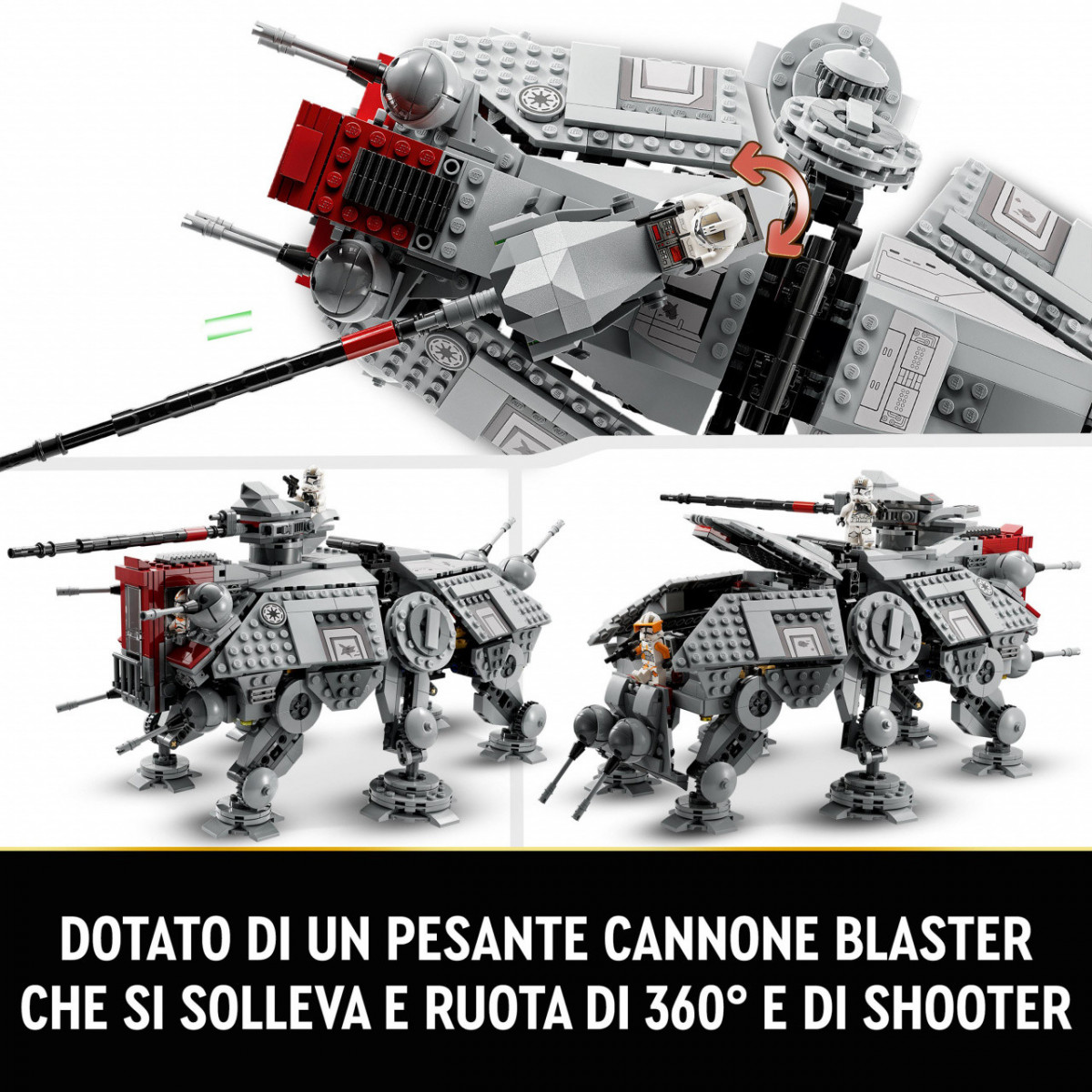 L’AT-TE presenta gambe snodabili e una maniglia estensibile per sollevarlo e spostarlo, oltre a un abitacolo staccabile e a 2 cabine dettagliate, con spazio sufficiente per 7 minifigure LEGO di Cloni Soldato. Questo gioco da costruire è inoltre dotato di: un pesante cannone blaster che si solleva e ruota di 360°, 2 shooter e un posto a sedere per il Clone Gunner del 212° battaglione, 6 cannoni blaster, 2 detonatori termici e altro ancora. Sono inclusi un modellino da costruire di Droide ragno, un fantastico assortimento di armi e 5 minifigure di personaggi LEGO Star Wars: il Comandante Cody, un Clone Gunner e 3 Cloni Soldato del 212° battaglione, da far combattere con 3 Droidi da battaglia LEGO.