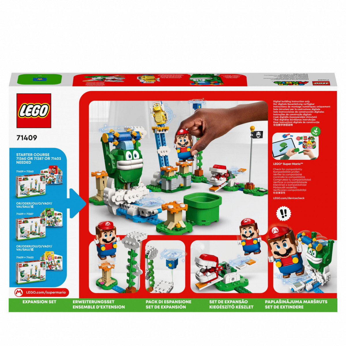 Attraverso l’app LEGO Super Mario da scaricare, si possono ottenere le istruzioni di costruzione per i bambini, oltre a suggerimenti creativi e altri contenuti divertenti per ottimizzare l’esperienza dei giocatori. Questo modellino da costruire rappresenta un'idea regalo straordinaria per i piccoli giocatori dai 7 anni in su, ed è perfetto per il divertimento e il gioco creativo sia da soli che in compagnia. Gli Starter Pack e i Pack di espansione LEGO Super Mario consentono ai fan di espandere, ricostruire e inventare livelli unici, per poter giocare a lungo e divertirsi a raccogliere monete.