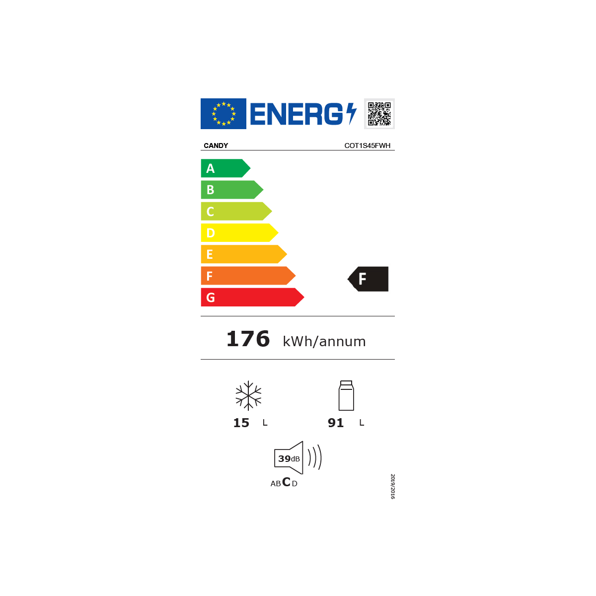 Candy Comfort COT1S45FSH. Posizionamento dell'apparecchio: Libera installazione, Colore del prodotto: Argento, Cerniera porta: Destra. Capacità netta totale: 106 L, Classe emissione rumore: C, Emissione acustica: 39 dB. Capacità netta frigorifero: 91 L, Tipo di lampada: LED. Posizione del congelatore: Posto in alto, Capacità netta congelatore: 15 L, Capacità di congelamento: 5,4 kg/24h. Classe efficienza energetica: F, Consumo energetico annuo: 176 kWh, Scala di efficienza energetica: Da A a G