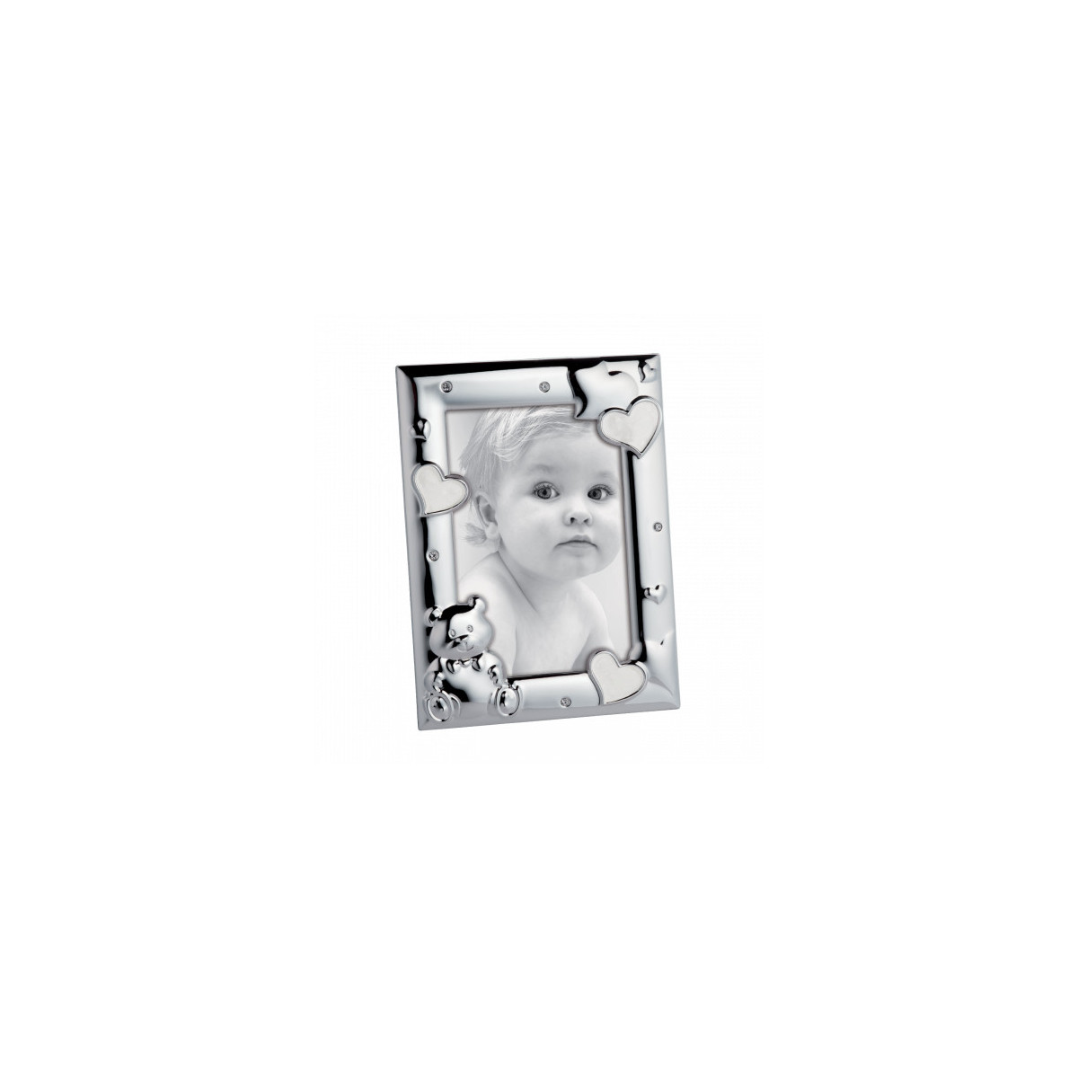 Portaritratti in metallo stampato, finitura lucida, con decori in rilievo, smalto e cristalli incastonati. Schienale velluto.