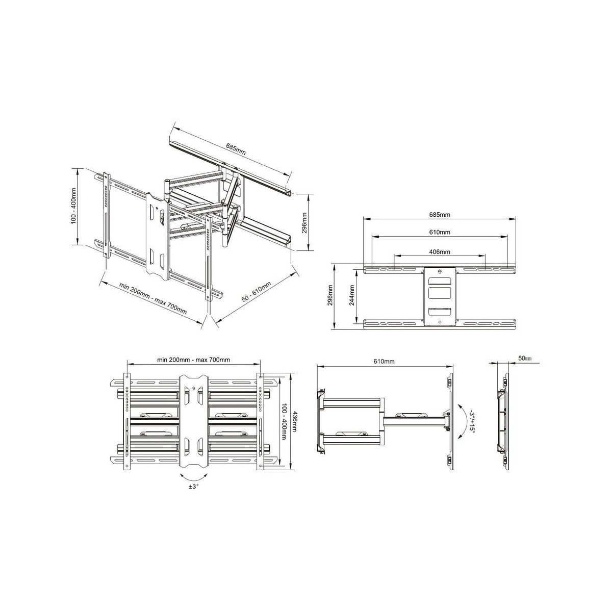 Multibrackets 6713. Peso massimo (capacità): 60 kg, Capienza minima dimensioni dello schermo: 139,7 cm (55"), Capienza massima dimensioni dello schermo: 2,03 m (80"), Compatibilità interfaccia di montaggio (min): 200 x 200 mm, Compatibilità interfaccia di montaggio (max): 700 x 400 mm. Inclinazione: -3 - 15°, Distanza dalla parete (min): 5 cm, Distanza dal muro (massima): 61 cm. Colore del prodotto: Nero