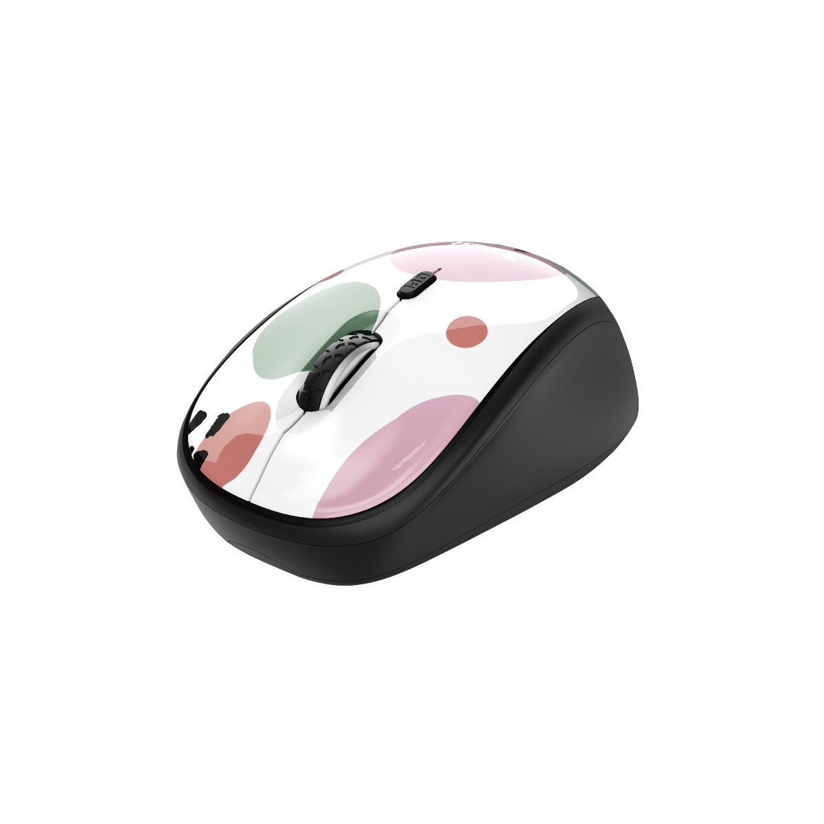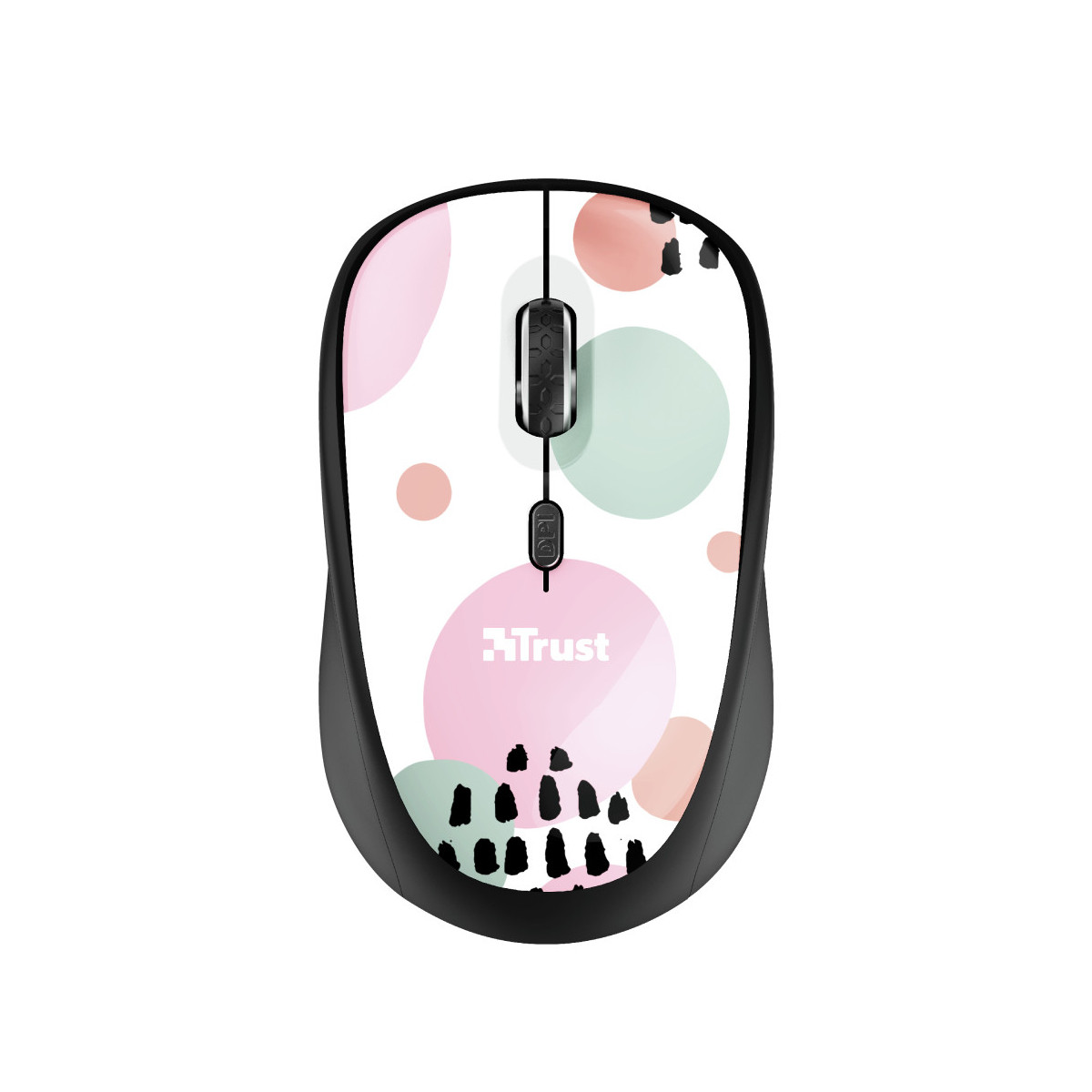 Trust Yvi. Fattore di forma: Mano destra. Tecnologia di rilevamento del movimento: Ottico, Interfaccia dispositivo: RF Wireless, Risoluzione movimento: 1600 DPI, Tipo di pulsanti: Tasti premuti, Numero di tasti: 4, Tipo di scorimmento: Rotella. Alimentazione: Batterie. Colore del prodotto: Multicolore