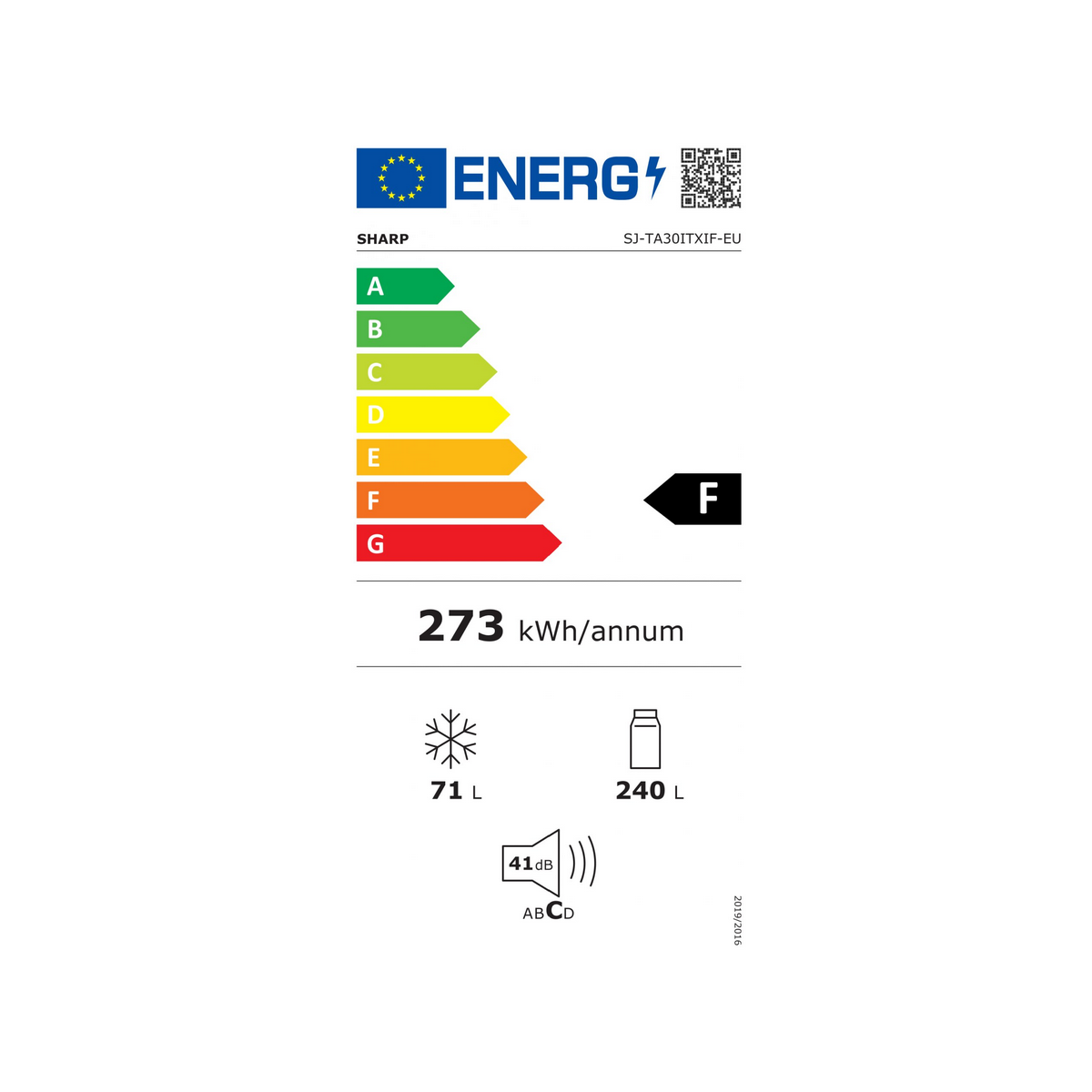 Friforifero doppia porta Sharp SJ-TA30ITXIF-EU . Capacità netta frigorifero 240 Litri. Classe energetica F dal 1 marzo 2021. Incernieramento porta a destra con possiblità di inversione. Indice di rumorosità tarato su 41 Decibel. Capacità netta congelatore 71 Litri. Congelatore con tecnologia No Frost. Frigorifero ventilato. Consumo energia annuo 273 Kilowatt. Emissione rumore classe C. Funzioni SMART non disponibili. Dispositivo non compatibile con assistenti vocali. Dotazione: Non presente
