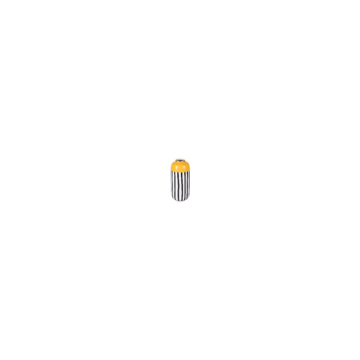 Vaso arredo cilindrico Luxury In ceramica Finitura lucida Collo giallo, corpo a righe bianche e nere Piede e orlo oro Misure: ø 16 x h. 36,5 cm (peso 1,946 Kg) Capacità 5,5 l