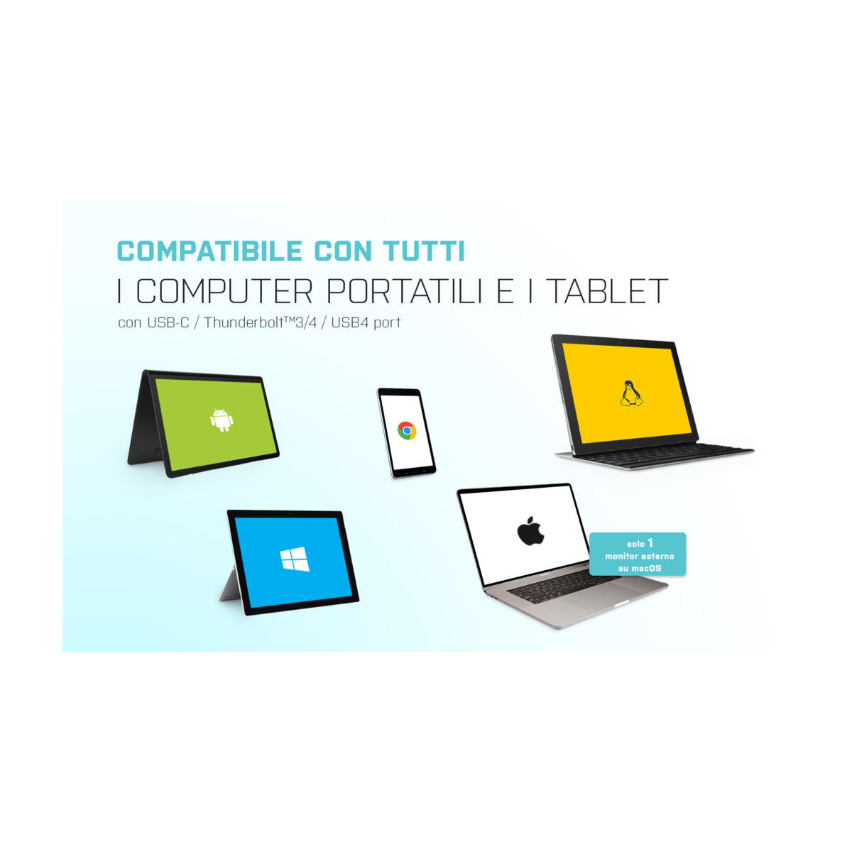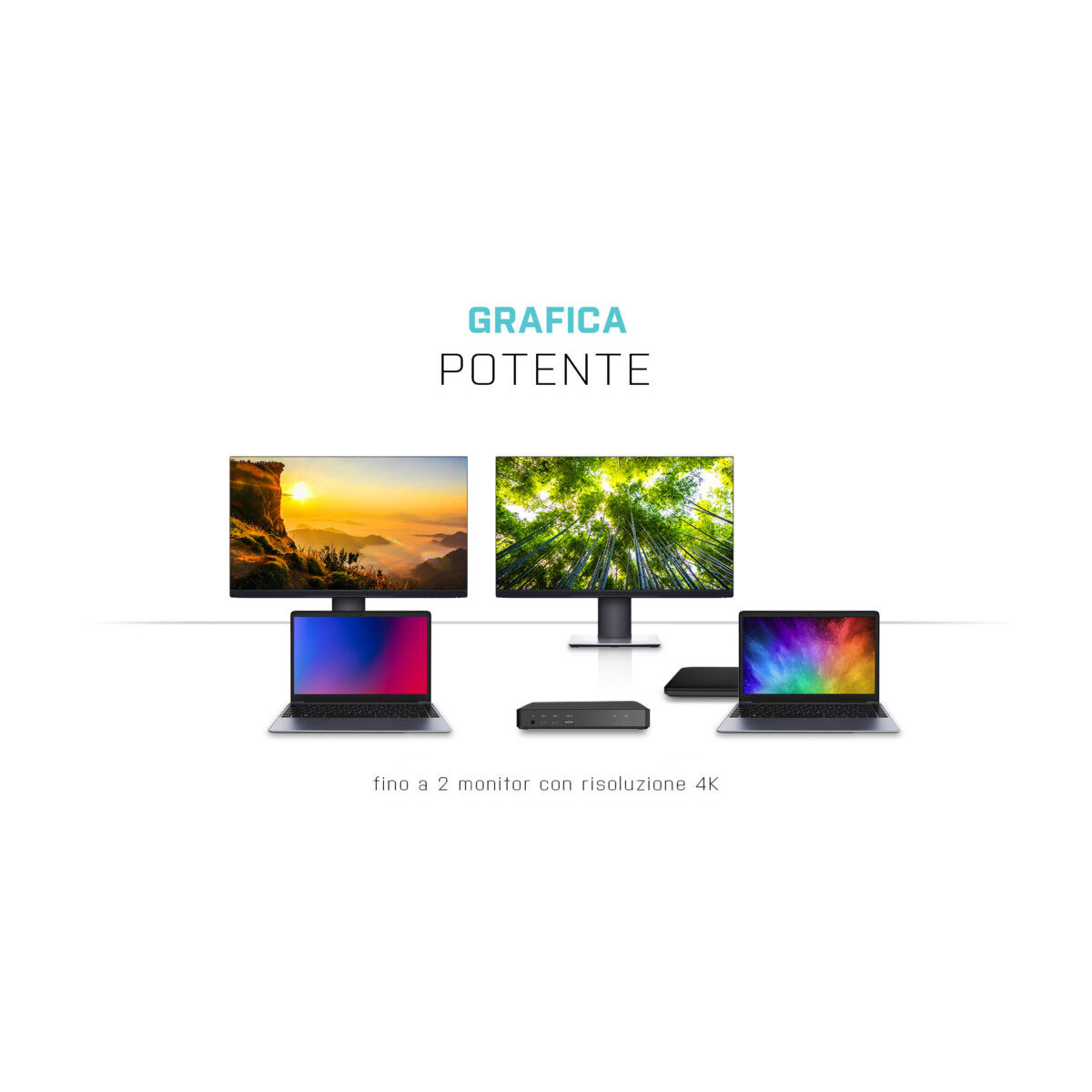 La workstation supporta l’uscita fino a due monitor esterni, e qualsiasi laptop con una porta Thunderbolt o USB-C (con supporto al trasferimento video) può essere collegato.