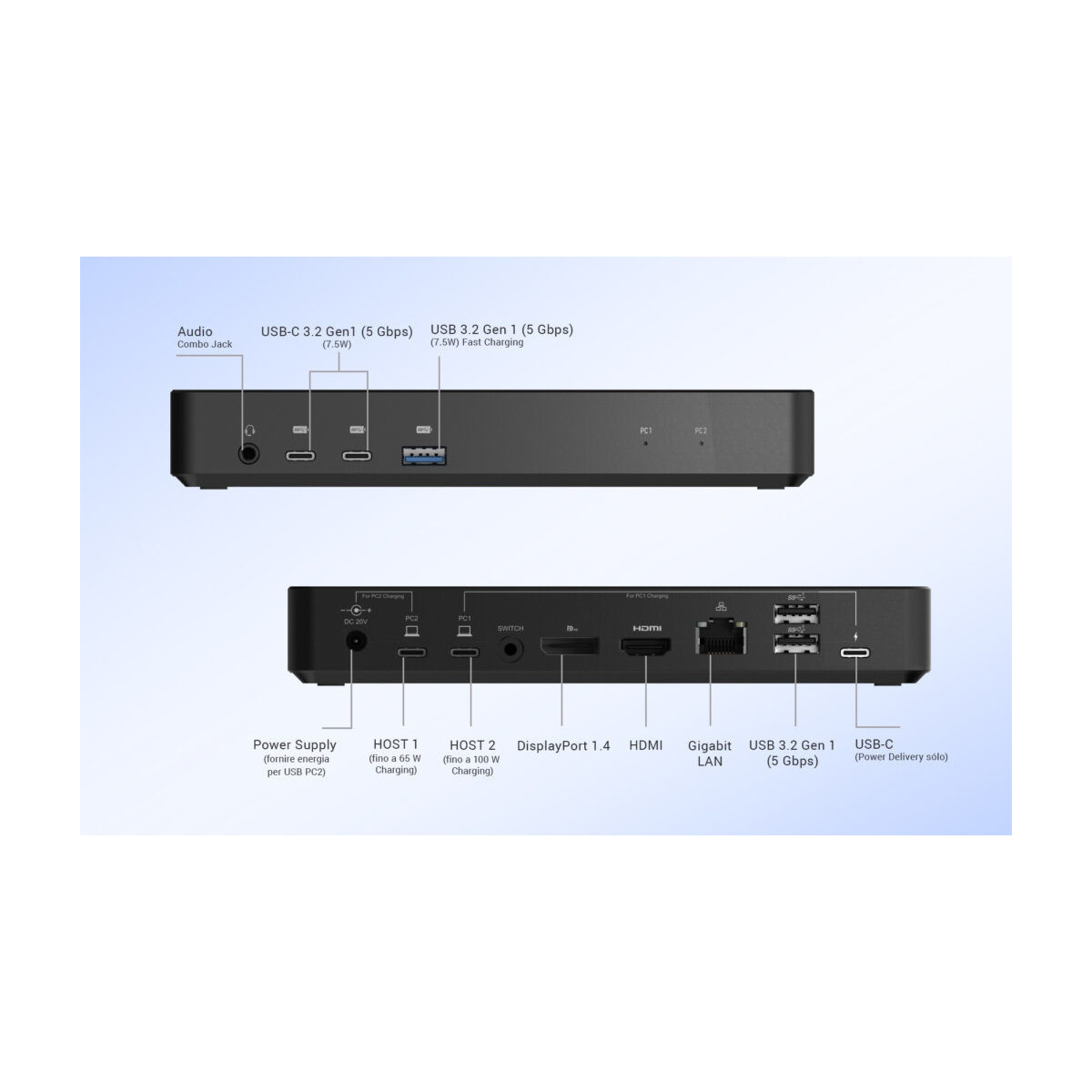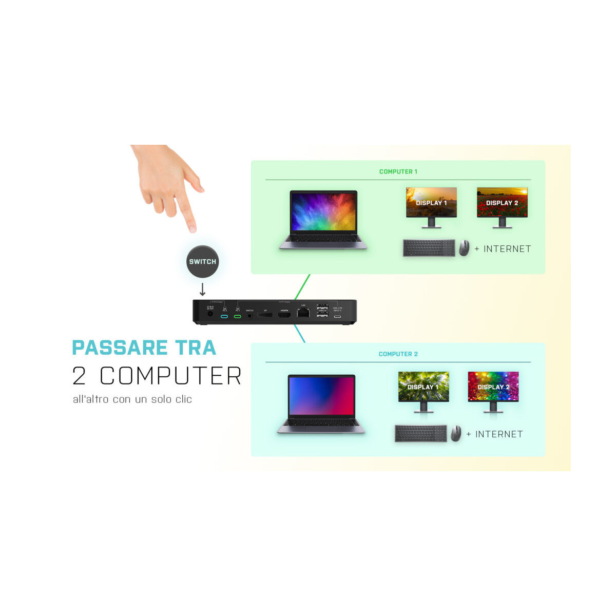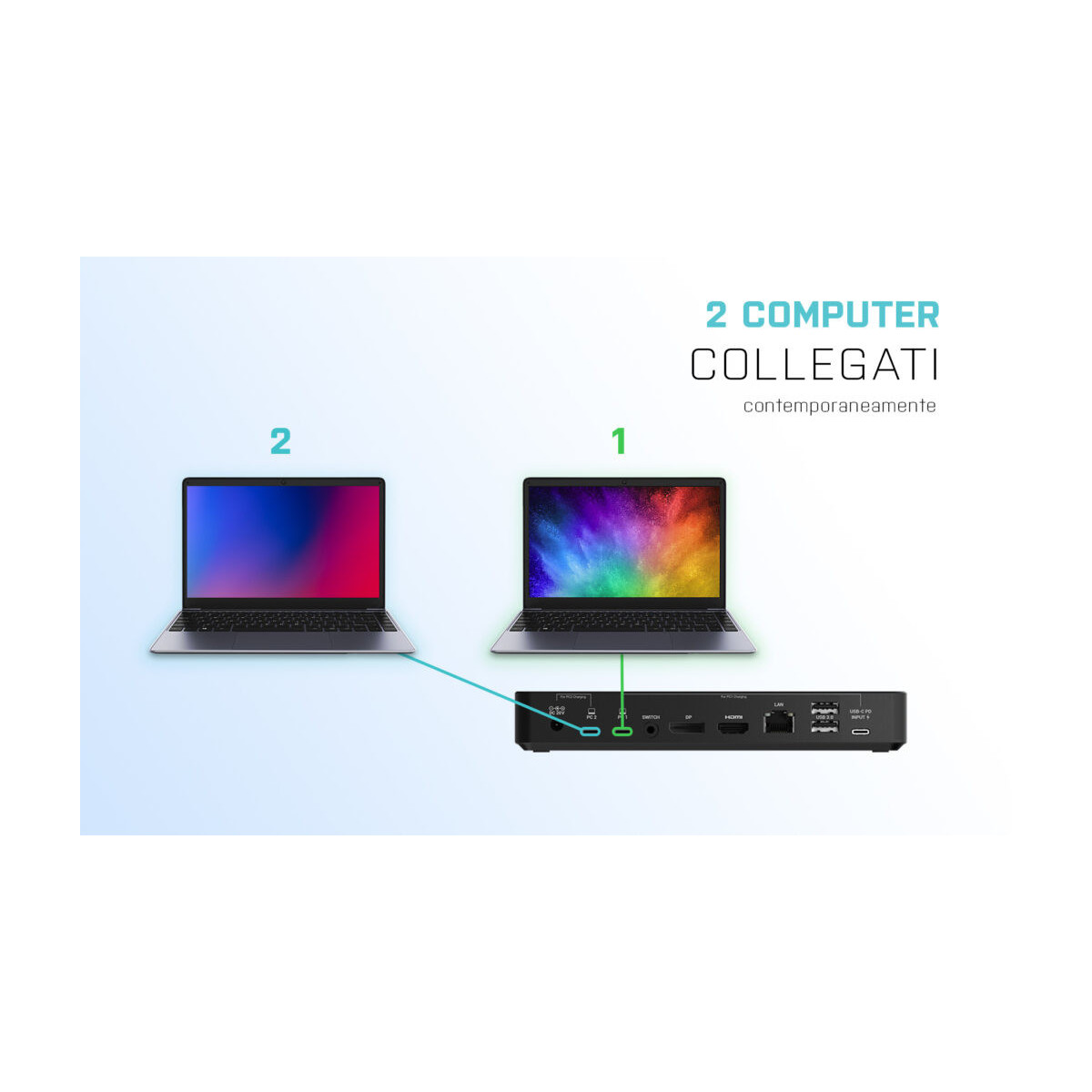 Una docking station USB-C che permette di collegare fino a due computer contemporaneamente. Passare da un computer all’altro è semplice, basta premere un pulsante. Così si possono avere due computer collegati alla docking station (per esempio, in una sala riunioni), o forse un computer e un tablet (o smartphone) sul posto di lavoro.