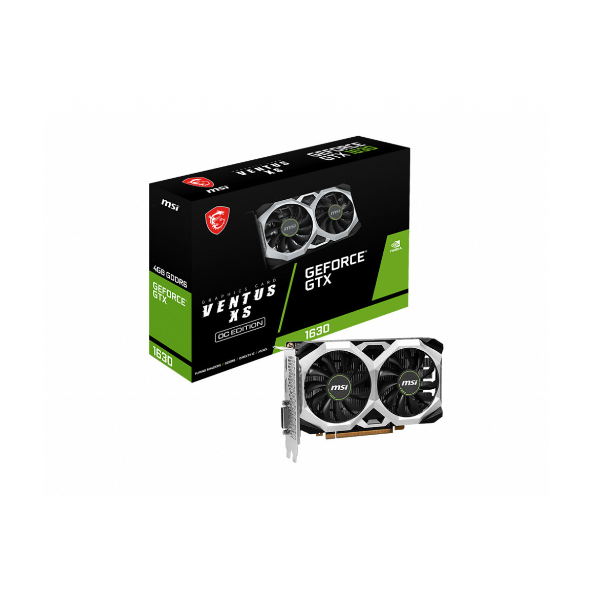 MSI GeForce GTX 1630 VENTUS XS 4G OC. Processore grafico / fornitore: NVIDIA, Processore grafico: GeForce GTX 1630. Memoria Grafica Dedicata: 4 GB, Tipo memoria adattatore grafico: GDDR6, Ampiezza dati: 64 bit. Risoluzione massima: 7680 x 4320 Pixel. Versione DirectX: 12.0, Versione OpenGL: 4.6, Dual Link DVI. Tipo interfaccia: PCI Express x16 3.0. Tipo di raffreddamento: Attivo, Numero di ventole: 2 ventola(e)