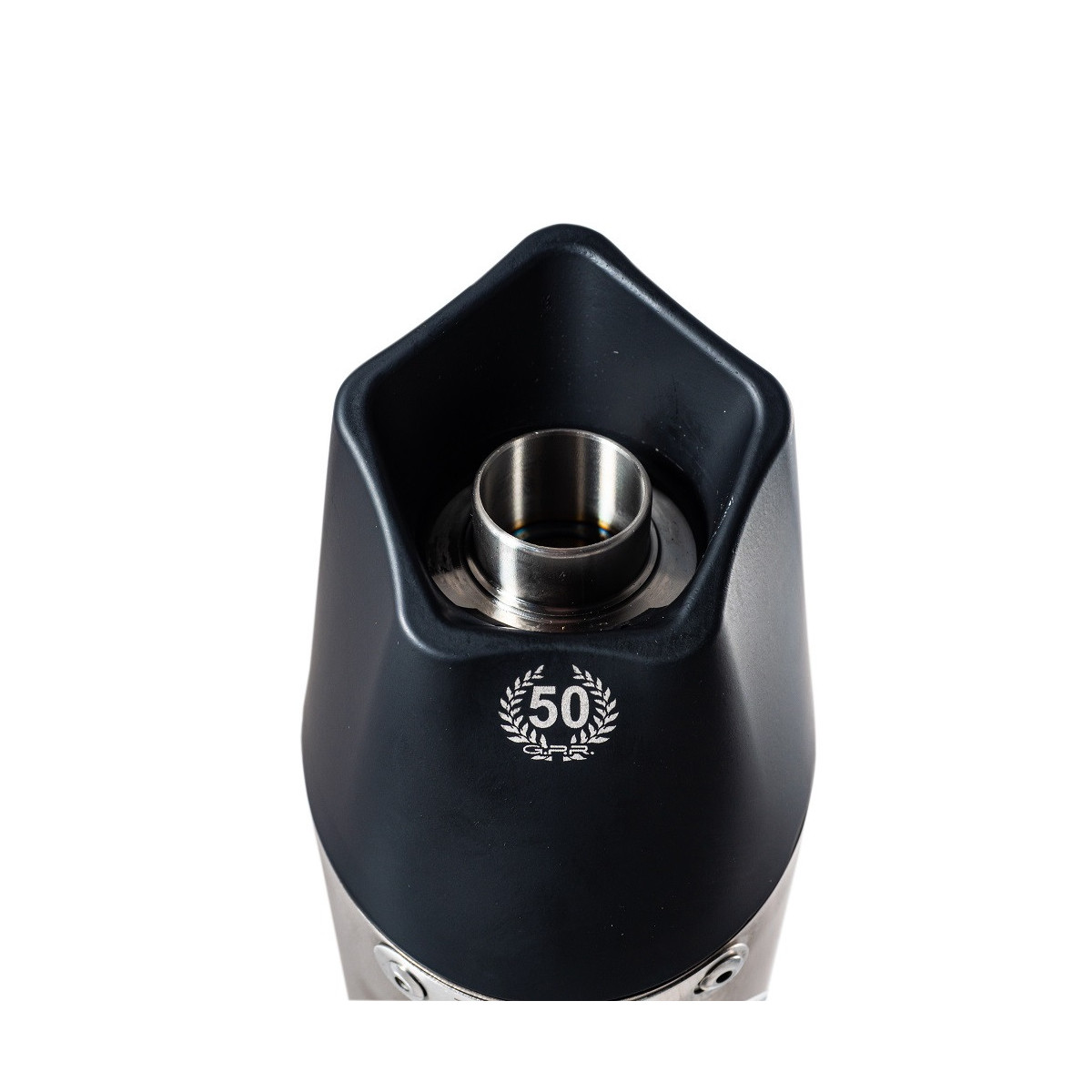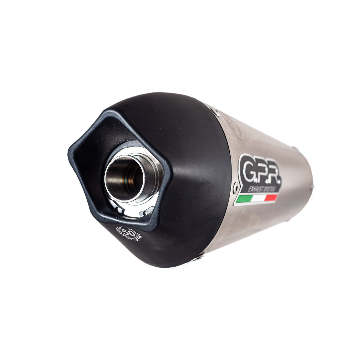 Lo scarico ha un dbkiller rimovibile (limitatore di rumore) per uso agonistico, rimuovere il dbkiller non è SOLO illegale, ma il cliente si assume la responsabilità di utilizzare la moto come solo sui circuiti, senza borse, senza frecce e porta targa o altro parti che entrerebbero in conflitto con il diverso angolo del gas a seguito della trasformazione nella versione da corsa. L'abuso di questa situazione sulla strada comporterà la perdita della garanzia del prodotto e qualsiasi richiesta di rimborso sarà respinta. Terminale GP Anniversary serie Titanio naturale, sviluppato per festeggiare i 50 anni del marchio, forma conica da tondo diam. 90 ad ovale diam 130mm, realizzato con corpo in Titanio satinato a mano e fondelli in Avional ricavati mediante lavorazione CNC Raccordo ed accessori per il montaggio: questo kit include il raccordo e/o semicollettore specifico e relativo kit di staffe ed accessori,che permettono un'installazione senza modifiche strutturali