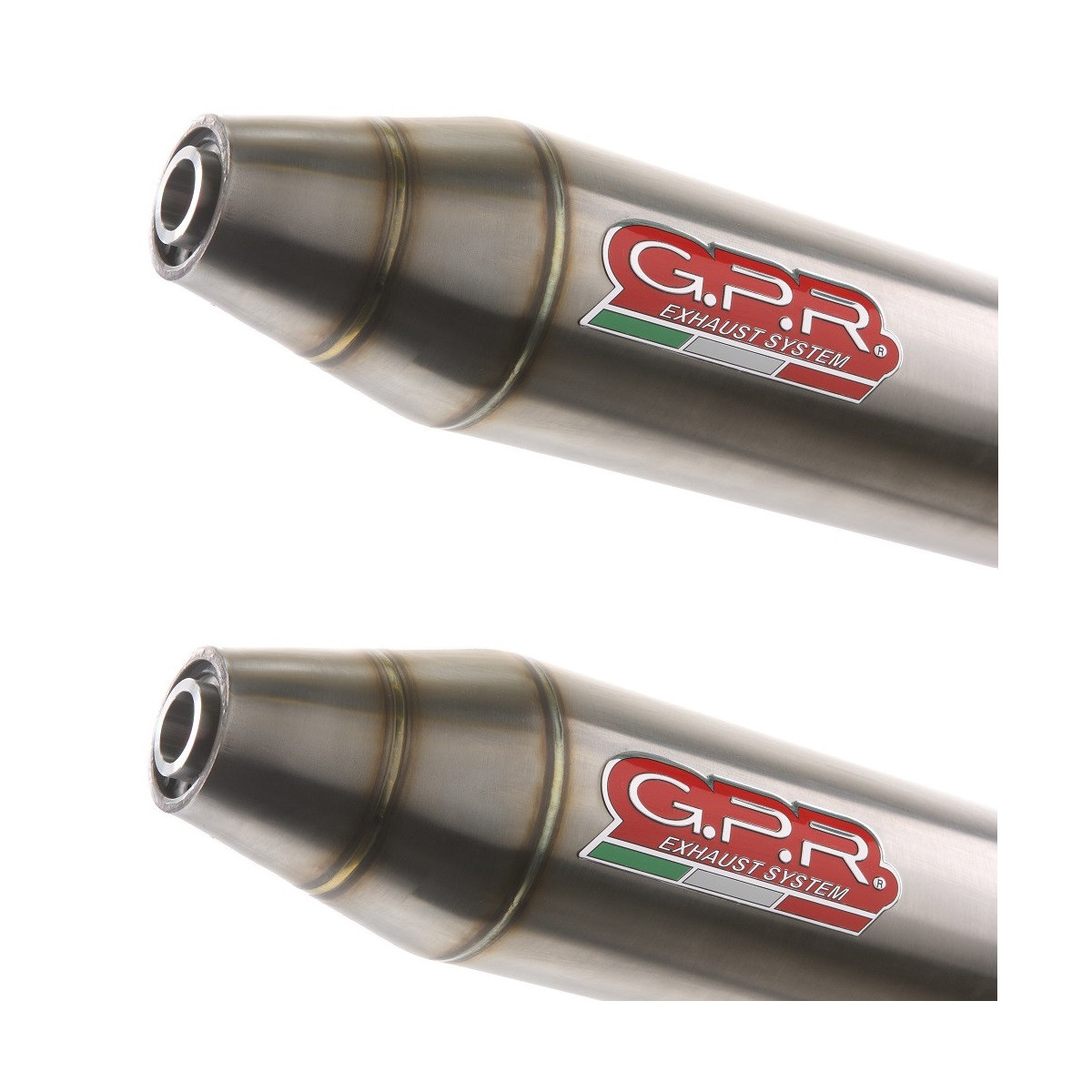 Per l'installazione non sono necessarie modifiche strutturali alla moto per un uso del prodotto in versione omologata. Lo scarico ha un dbkiller rimovibile (limitatore di rumore) per uso agonistico, rimuovere il dbkiller non è SOLO illegale, ma il cliente si assume la responsabilità di utilizzare la moto come solo sui circuiti, senza borse, senza frecce e porta targa o altro parti che entrerebbero in conflitto con il diverso angolo del gas a seguito della trasformazione nella versione da corsa. L'abuso di questa situazione sulla strada comporterà la perdita della garanzia del prodotto e qualsiasi richiesta di rimborso sarà respinta. Terminale della serie Deeptone ATV, realizzato in acciaio inox 304 satinato a mano, con saldature TIG a vista sul cono, forma tonda di diametro 100mm. Collettore: Viene fornito il collettore specifico,comprensivo di flange,boccole e relativo kit di staffe, il Completo GPR monta direttamente sui cilindri senza apportare modifiche strutturali,a seguito installazione potrebbe essere necessario rimappare la centralina.
