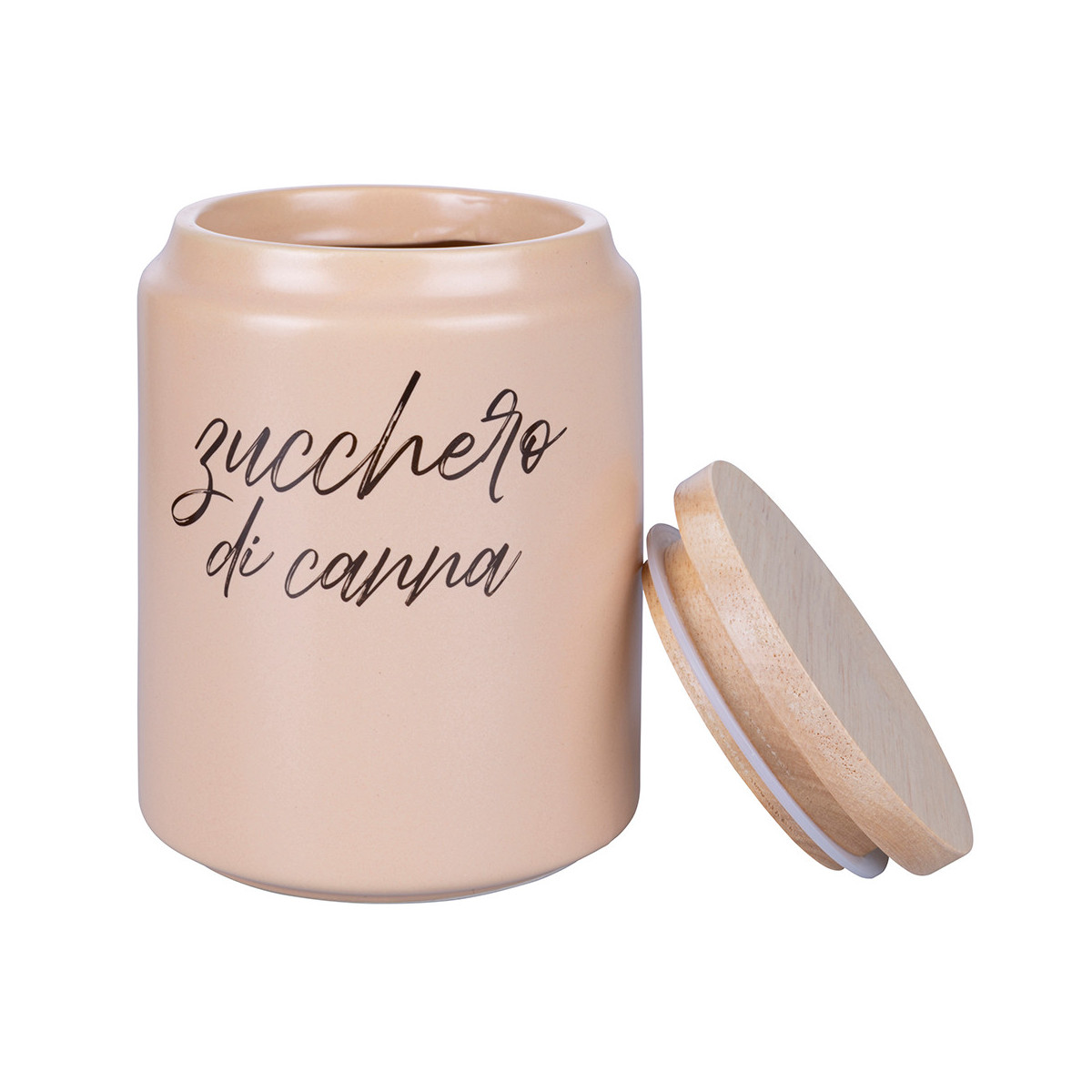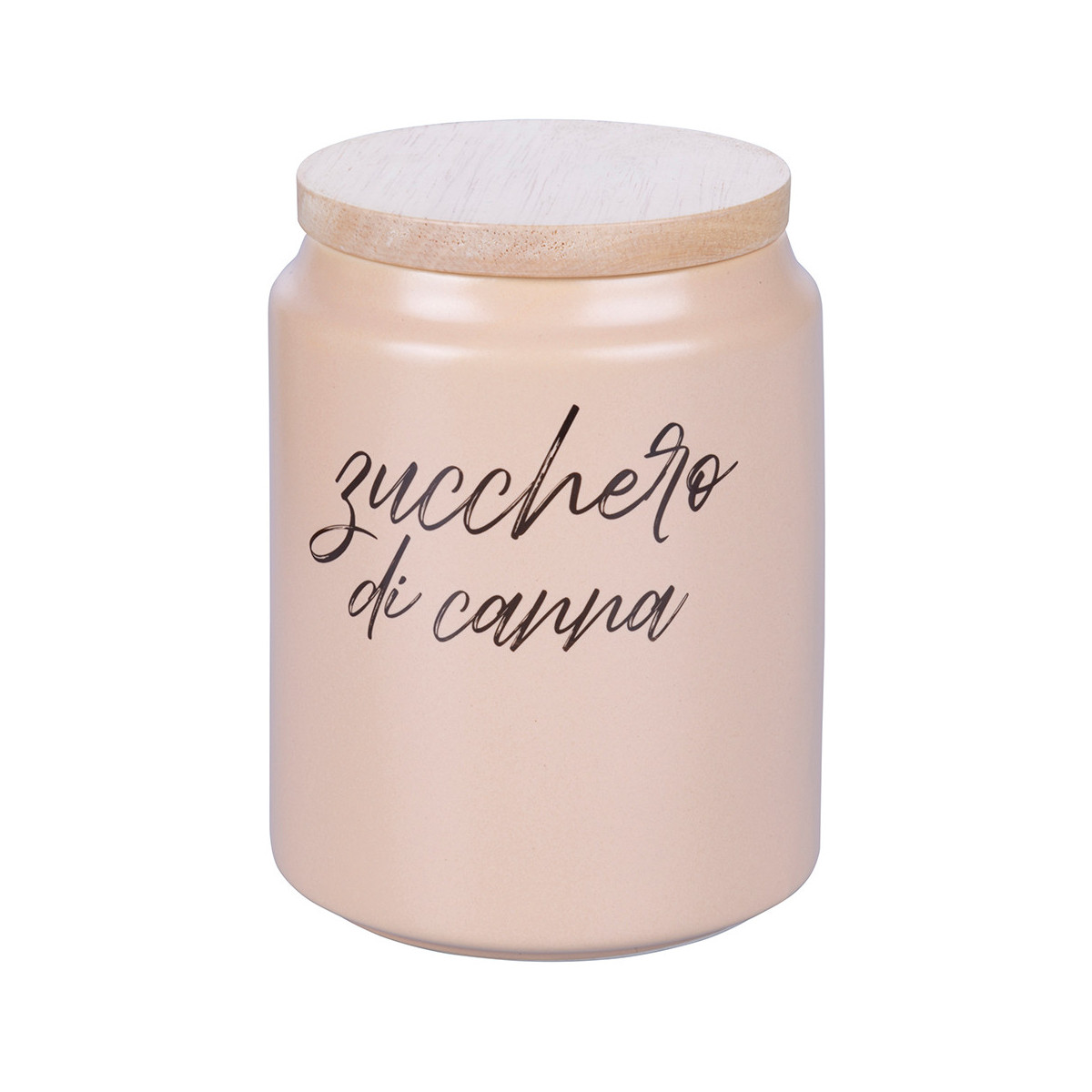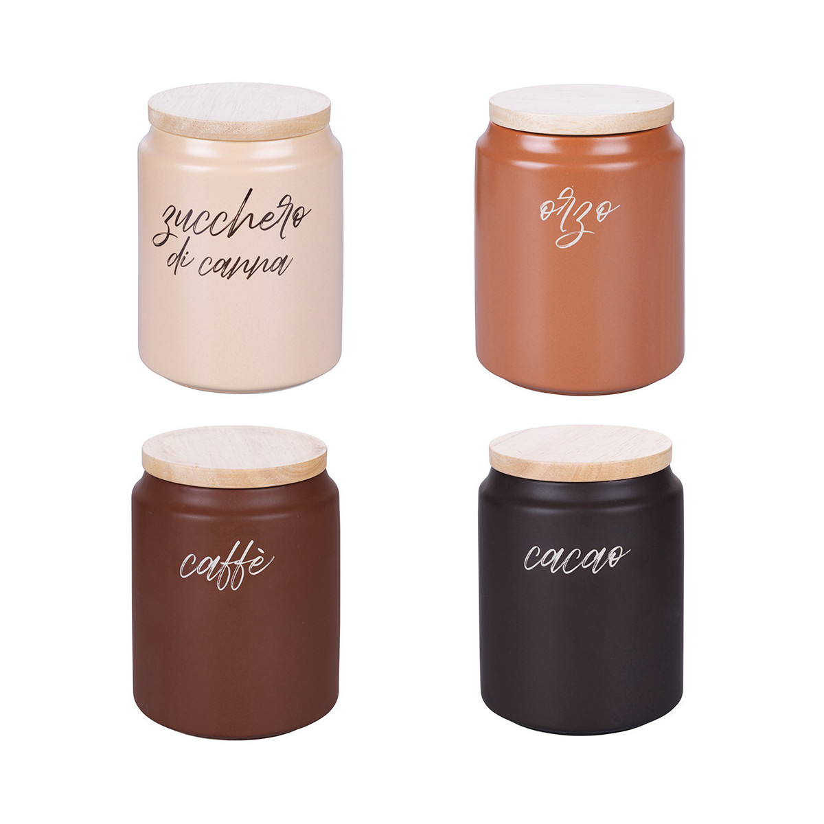 Set composto da 4 barattoli in 4 colori e scritte differenti: rosa chiaro "zucchero di canna", marrone chiaro "orzo", marrone scuro "caffè", nero "cacao"