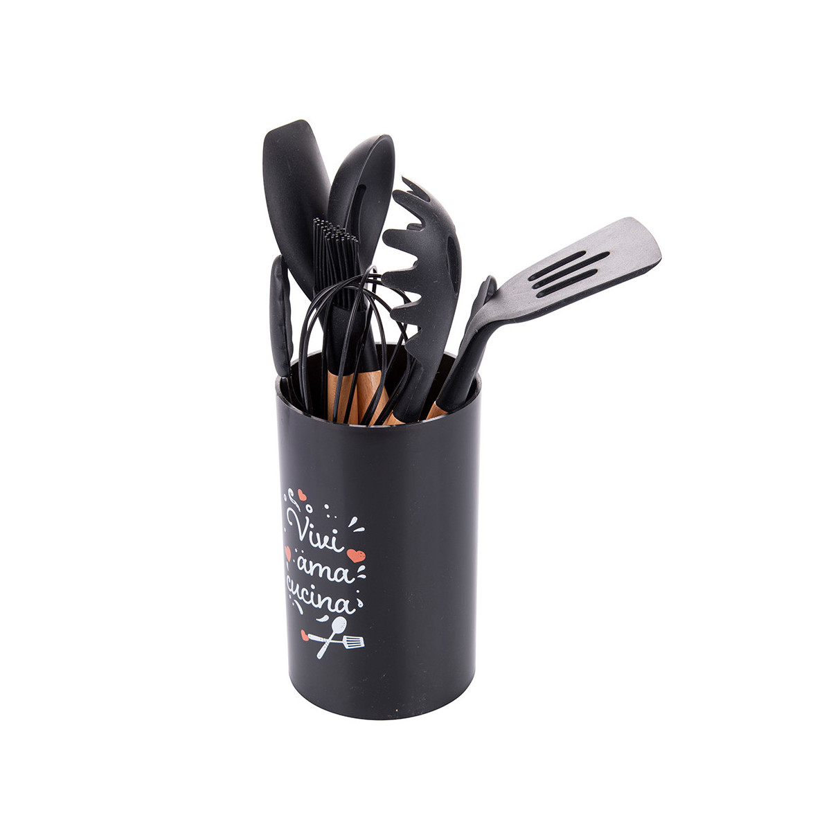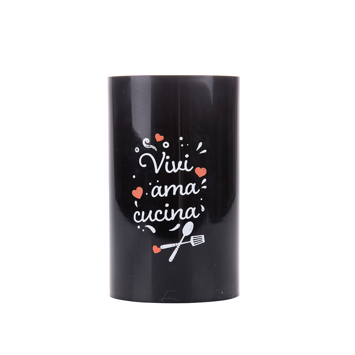 Portautensili nero in plastica con scritta: "Vivi, ama, cucina"