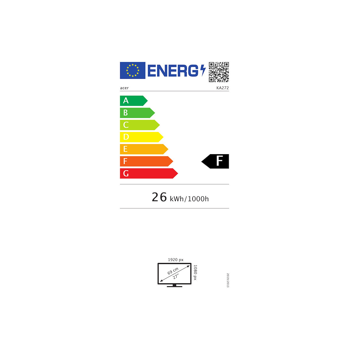 Acer KA2 KA272ABI. Dimensioni schermo: 68,6 cm (27"), Risoluzione del display: 1920 x 1080 Pixel, Tipologia HD: Full HD, Tempo di risposta: 1 ms, Rapporto d'aspetto nativo: 16:9, Angolo di visualizzazione (orizzontale): 178°, Angolo di visualizzazione (verticale): 178°. Montaggio standard VESA. Colore del prodotto: Nero