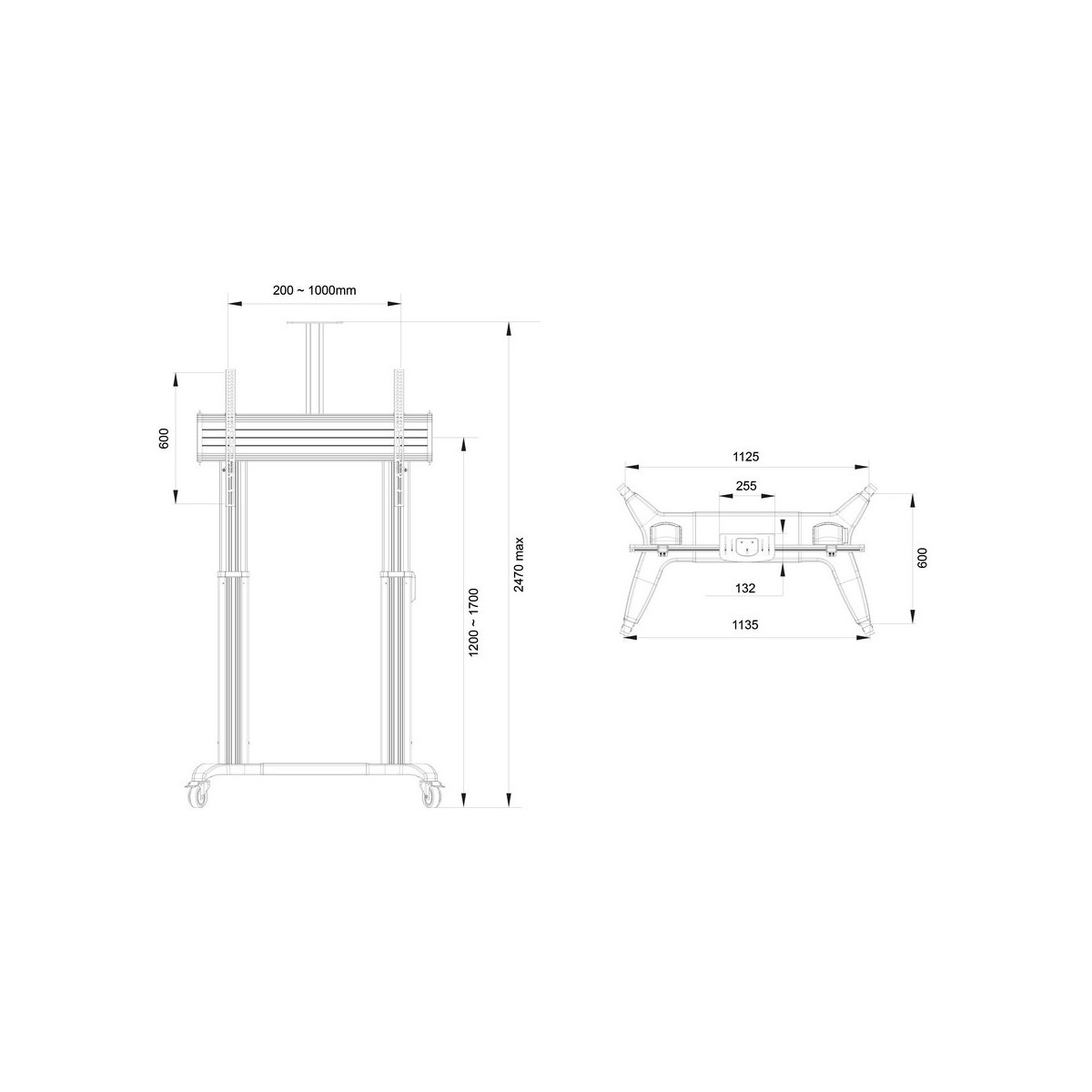 Multibrackets 3120. Peso massimo (capacità): 135 kg, Capienza minima dimensioni dello schermo: 165,1 cm (65"), Capienza massima dimensioni dello schermo: 2,79 m (110"), Compatibilità interfaccia di montaggio (min): 200 x 200 mm, Compatibilità interfaccia di montaggio (max): 1000 x 600 mm. Range di regolazione altezza: 1200 - 1700 mm. Colore del prodotto: Nero
