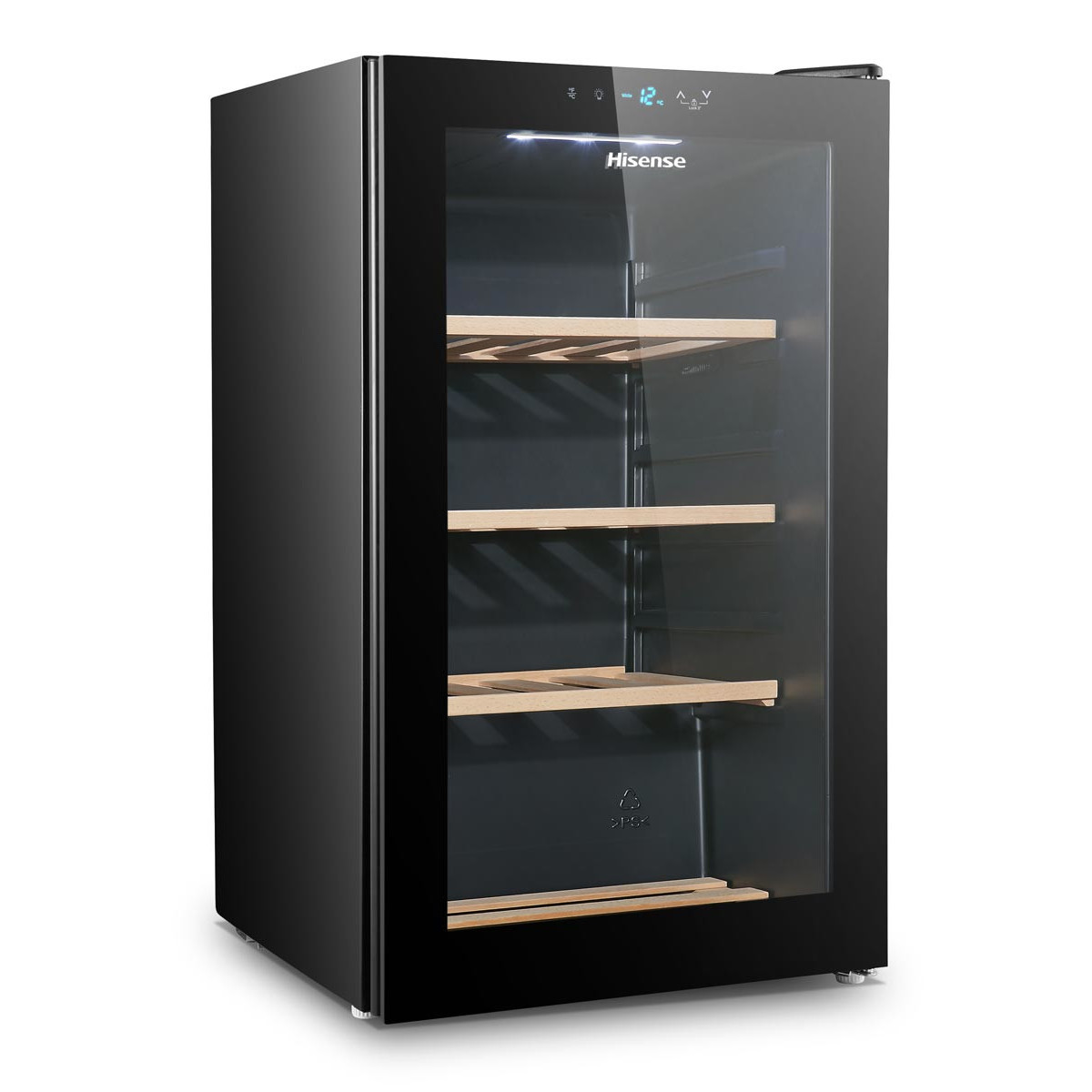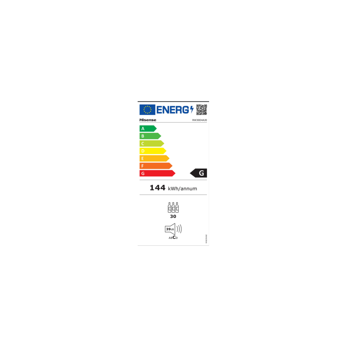 Hisense RW30D4AJ0. Posizionamento dell'apparecchio: Libera installazione, Colore struttura: Nero, Colore interno: Nero. Capacità bottiglie: 30 bottiglia/bottiglie, Tipo di prodotto: Cantinetta vino con compressore, Intervallo temperatura (zona 1): 5 - 20 °C. Classe efficienza energetica: G (A), Consumo energetico annuo: 144 kWh. Tipo di controllo: Touch, Tipo di display: LED, Tipo di lampada: LED. Larghezza: 490 mm, Profondità: 489 mm, Altezza: 844 mm